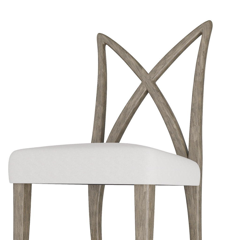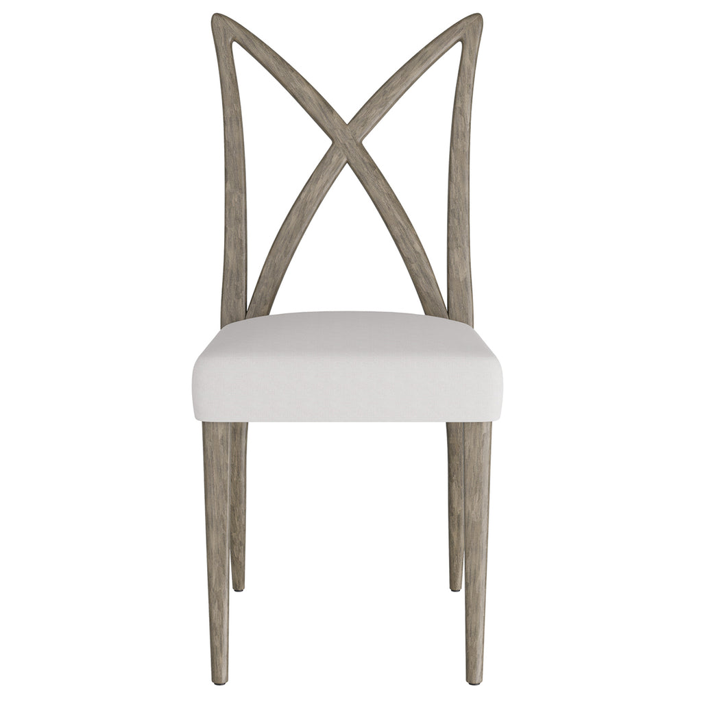 The sleek lines of the Arteriors Xavier Dining Chair were inspired by the sculptural furniture of mid-century italian design. An airy crown back of streamlined, curved smoke-finished wood contrasts a wide cushion seat of textural white linen. Together, they provide a pleasing form even more impactful when multiplied in a formal setting.