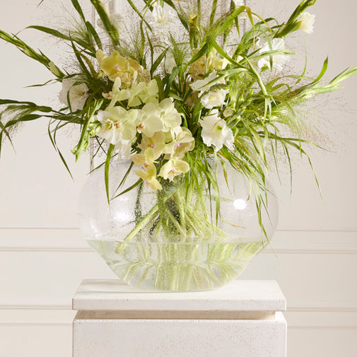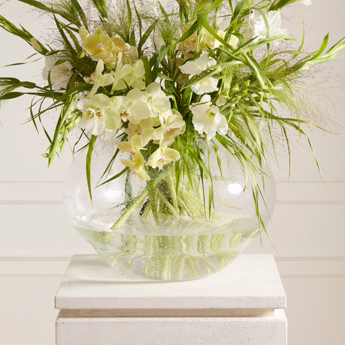 Make a statement for a modern event or an attention commanding home entry with the Bala Vase, a large-scale, clear glass vase, mouth blown by Polish artisans. With a rounded silhouette that has a tapered foot and low lip around the opening, the Bala Vase has ample space for florals inside and out, or for a unique planting. Small bubbles within the glass add texture and a unique look to each piece.