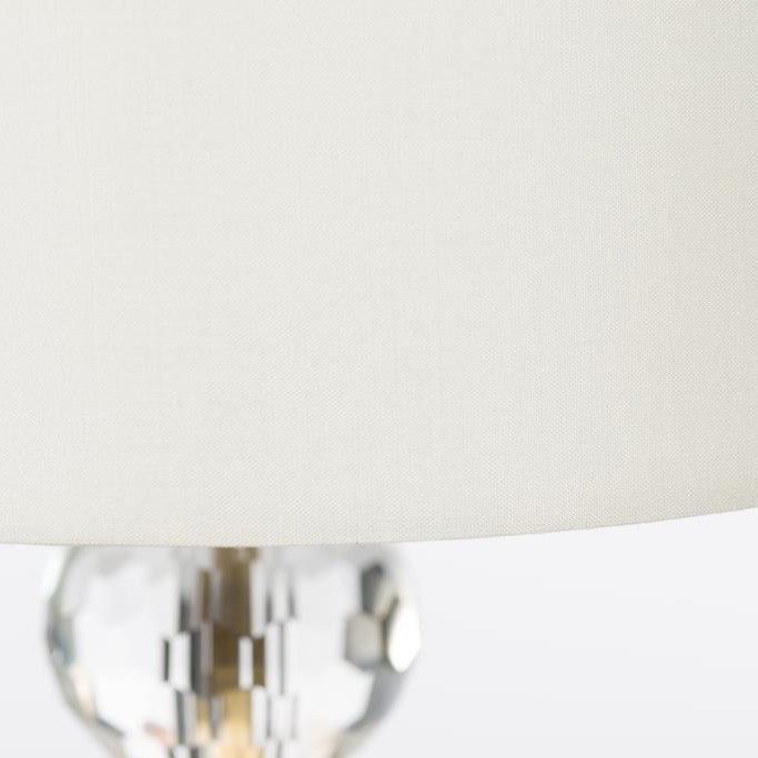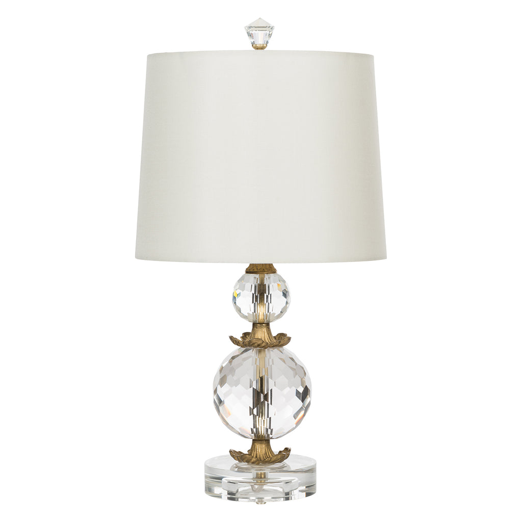 Dress up a bedroom with a dazzling touch of shine. This gorgeous, tiered table lamp flaunts two crystal balls cut with honeycomb shapes, brought together by delicate floral shapes made from exquisite Italian brass. Topped with a soft silk shade, this gorgeous lamp is a truly lavish accent piece that's sure to elevate any home.