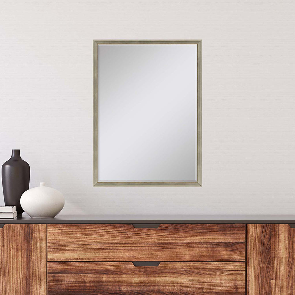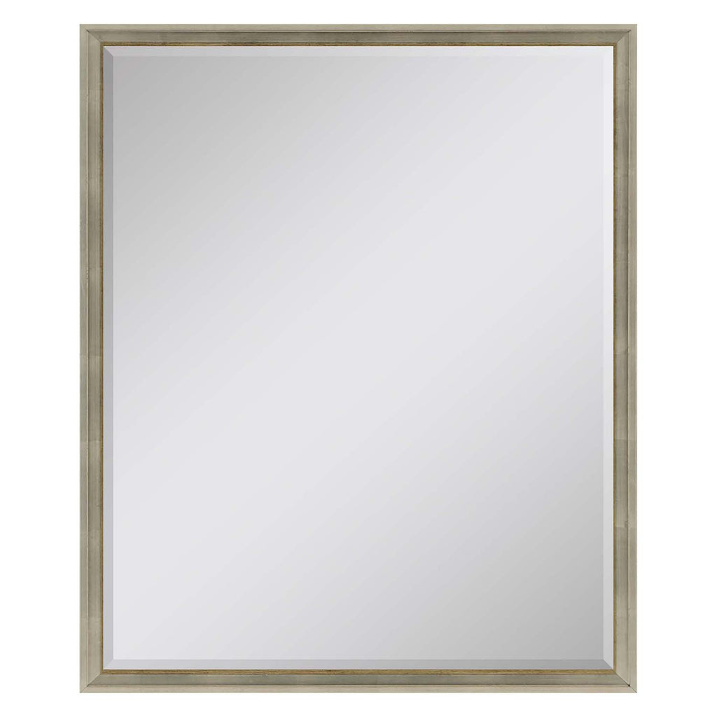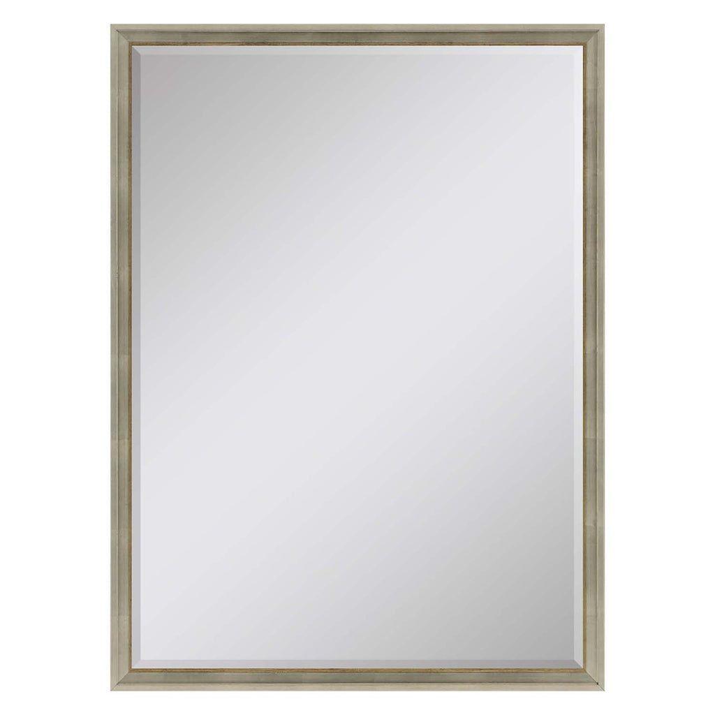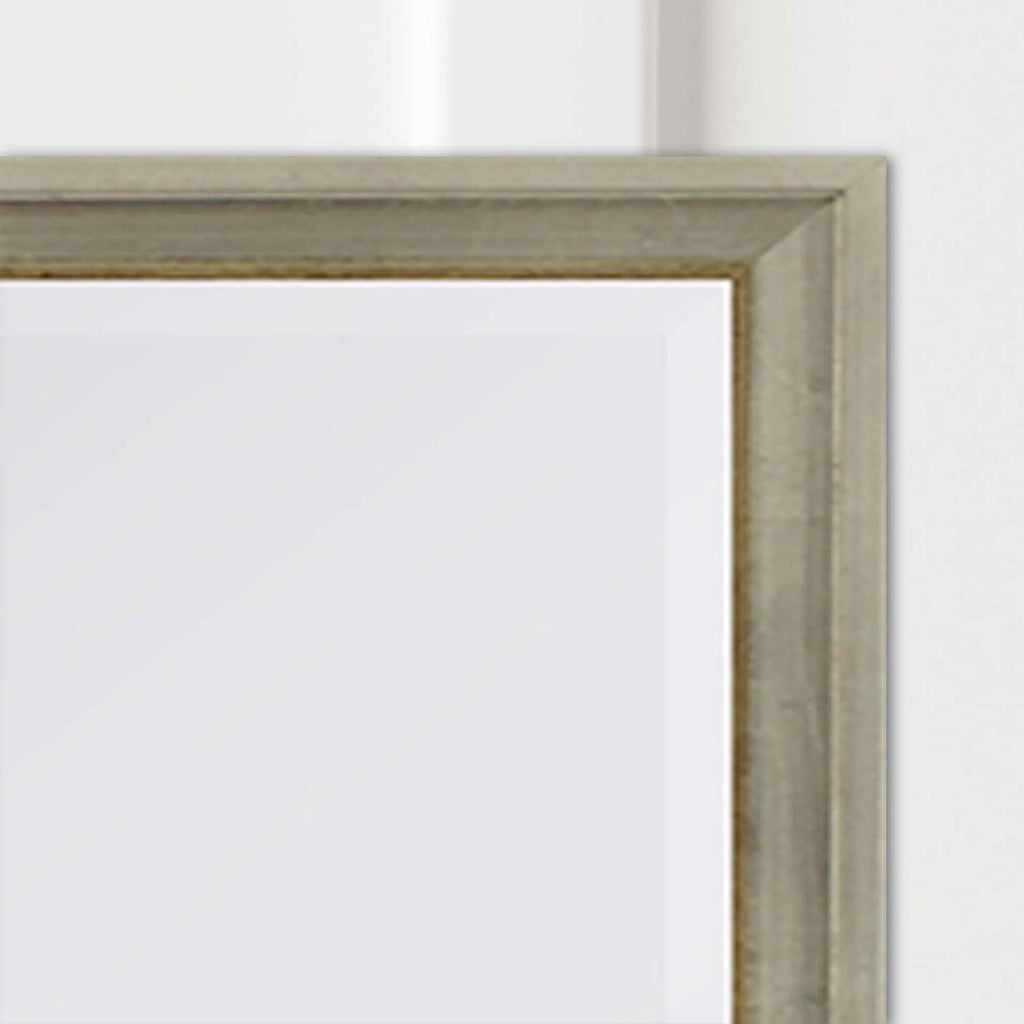 Elegant beveled mirror is framed in a silver leaf wood shadow box style molding with gold wash edging and black side.