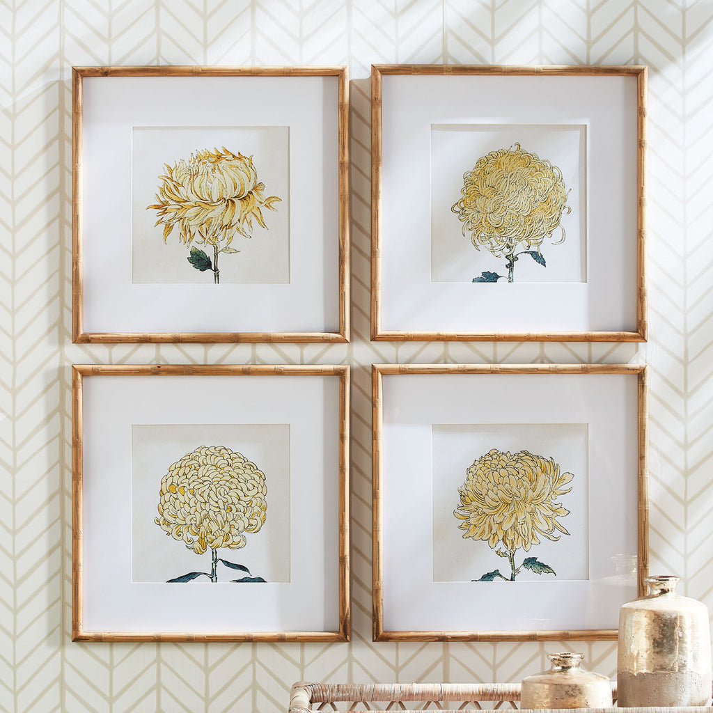 Ever-changing, the stages in the life of a chrysanthemum are captured in these captivating illustrations. Feminine in nature, they add a touch of soft yellow to powder room, kitchen or study.