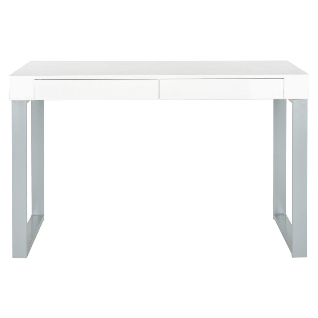 With its uncomplicated, linear design in white lacquer top and sturdy grey painted iron base, this contemporary desk features a sophisticated, well-mannered profile. Two drawers offer plenty of room for storing a laptop, tablet or other essentials.
