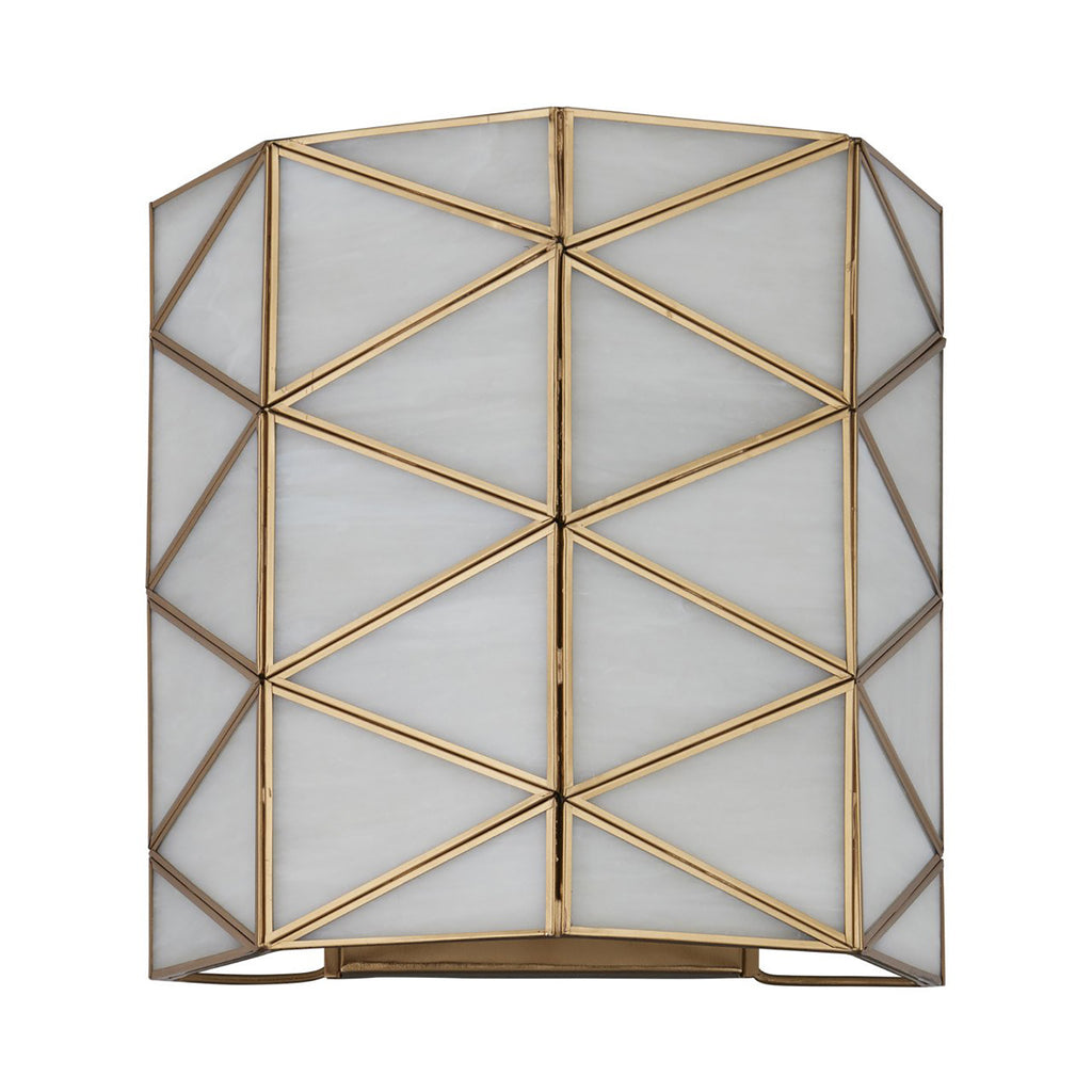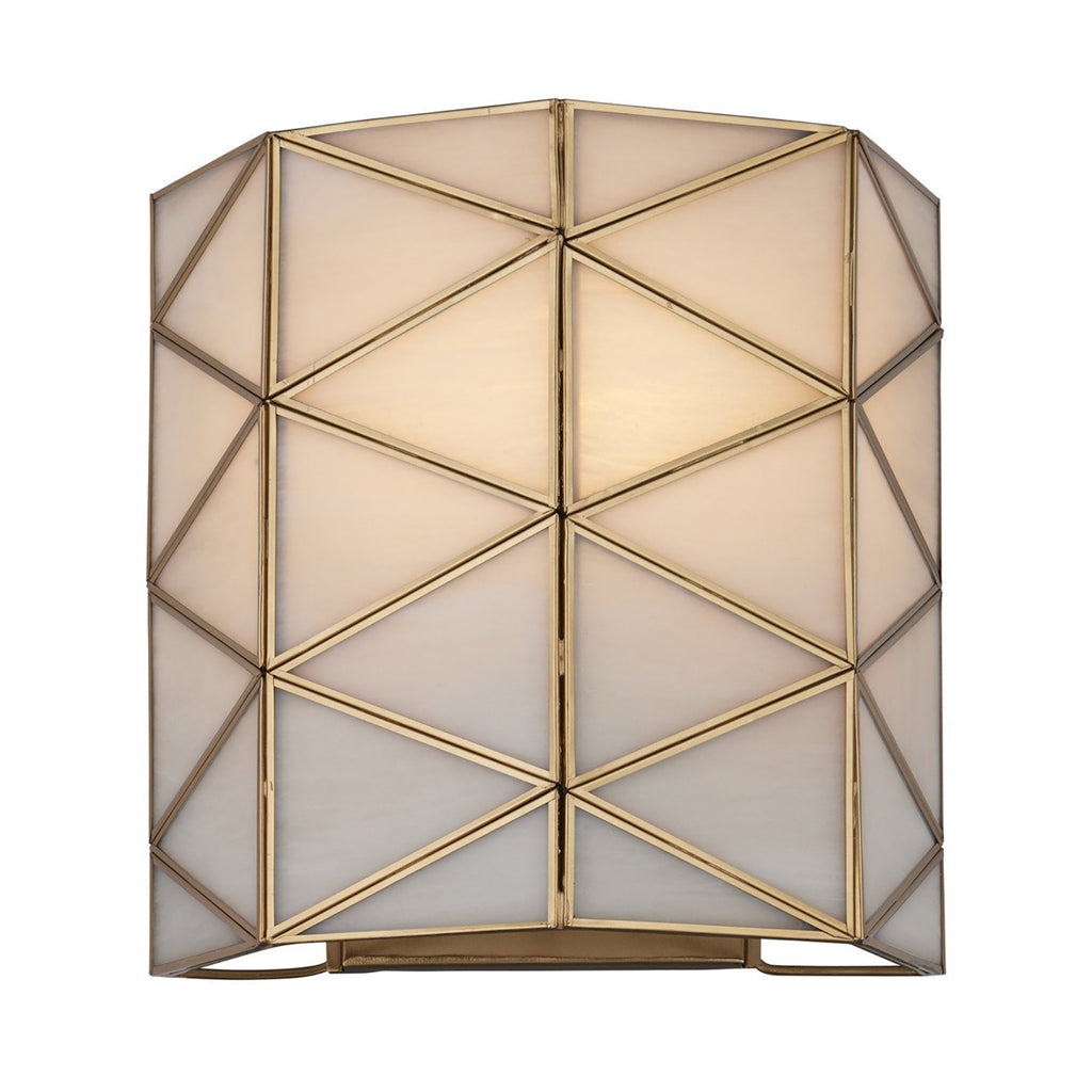 The name of the Currey & Co Polyhedron Wall Sconce pays homage to its triangular panes of white glass surrounded by antique brass delineations in an antique brass finish. Though the glass looks uniform when the illumination warms it, there are subtle drifts of milkier white in some spots that others, which adds a bit of texture to this geometric design.