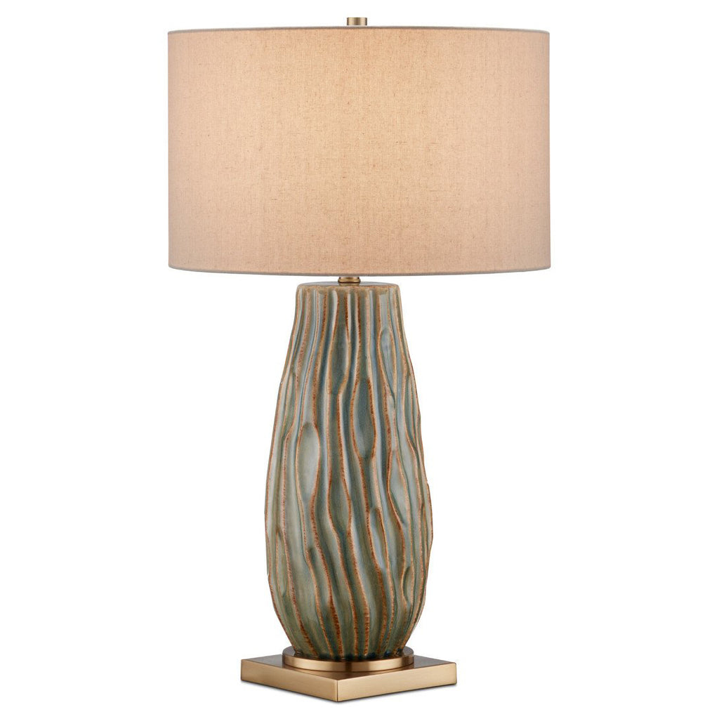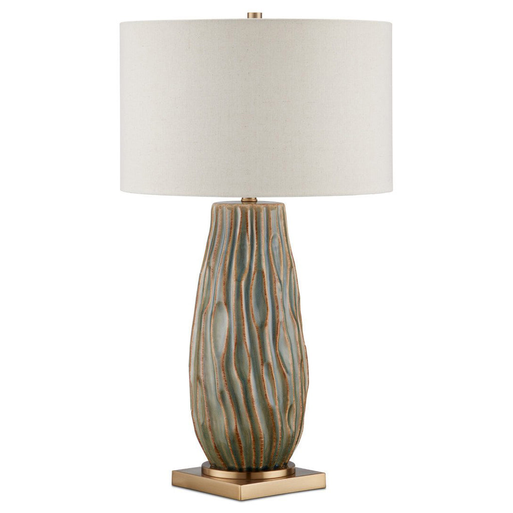 The Water-borne Table Lamp, with its flowing peaks and valleys, looks like a gushing stream in the springtime. Made of ceramic, the artful composition is covered in a forest reactive glaze with green hues filling the valleys and tan tones enlivening its peaks. The green lamp rises from a metal base in an antique brass finish and a matching finial fastens the drum shade to the fixture.