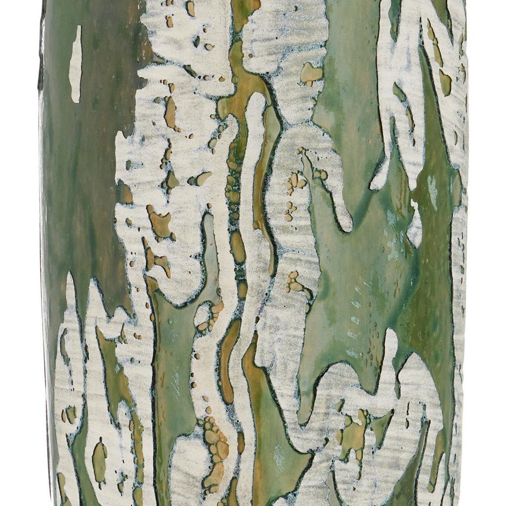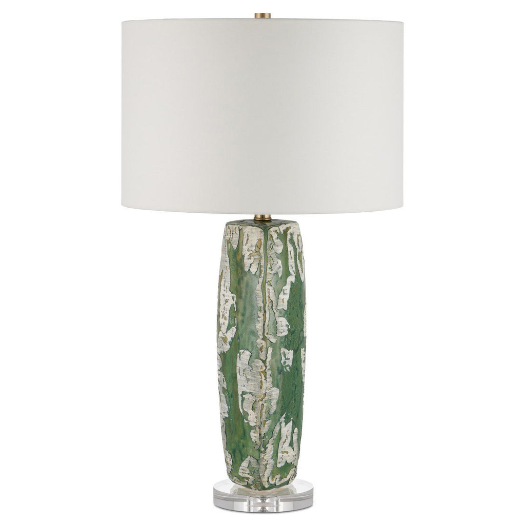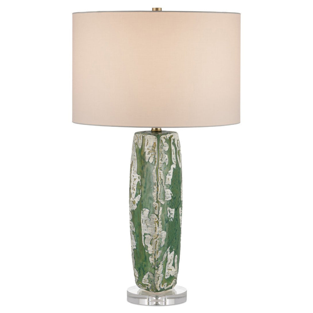 The Zowan Table Lamp is made of ceramic in a matte green smoke glazing flowing along its surface that looks like a genealogical map. The cream that overlays the green has been hand-applied to bring the lamp an artful feel, and the optic crystal base from which the fixture rises leaves the painterly column to be the focal point of the design. One of the interesting things about this green lamp is that the pattern will change slightly when seen from different angles.