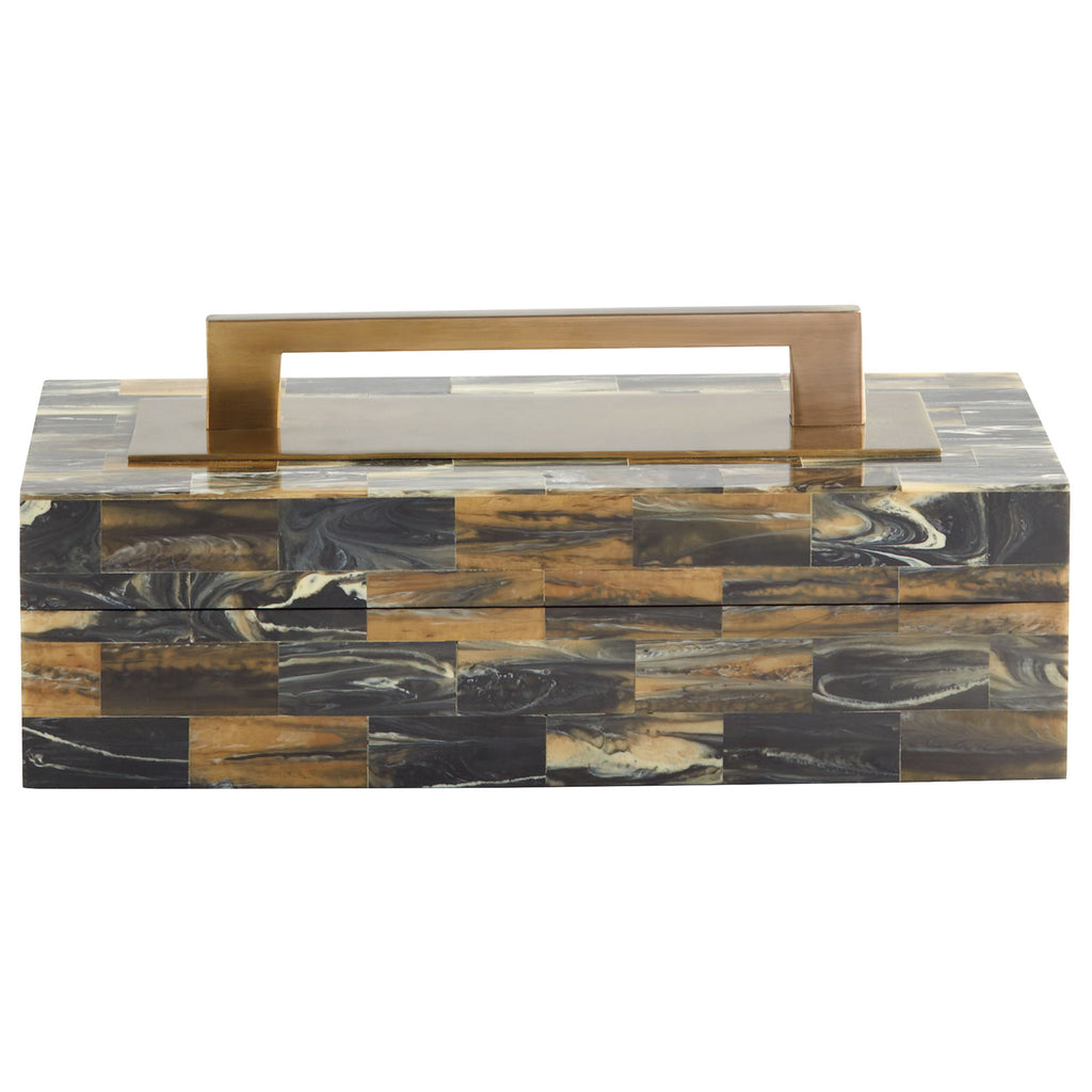 Cairo, or “victorious city,” is the home of last remaining site of the Seven Wonders of the Ancient World, the Great Pyramid. Inspired by the timeless form of the pyramid, the Cairo box is hand-crafted and assembled from a mosaic of multi-colored triangular pieces meticulously cut from faux horn. This lidded box opens to reveal a black-painted interior. Each piece is a unique display of variations in color. Moziac of geometric pieces assembled to fit the triangular forms.