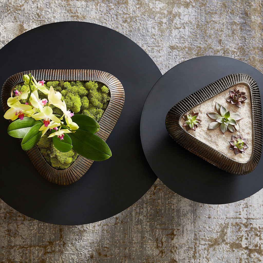 The Prism series is a collection of heavily textured and striated decorative bowls. Its signature triangular shape is constructed of durable cast aluminum in an antique bronze finish. Turn heads by showcasing these vessels as a table top accessories or by placing them on a large bookshelf.
