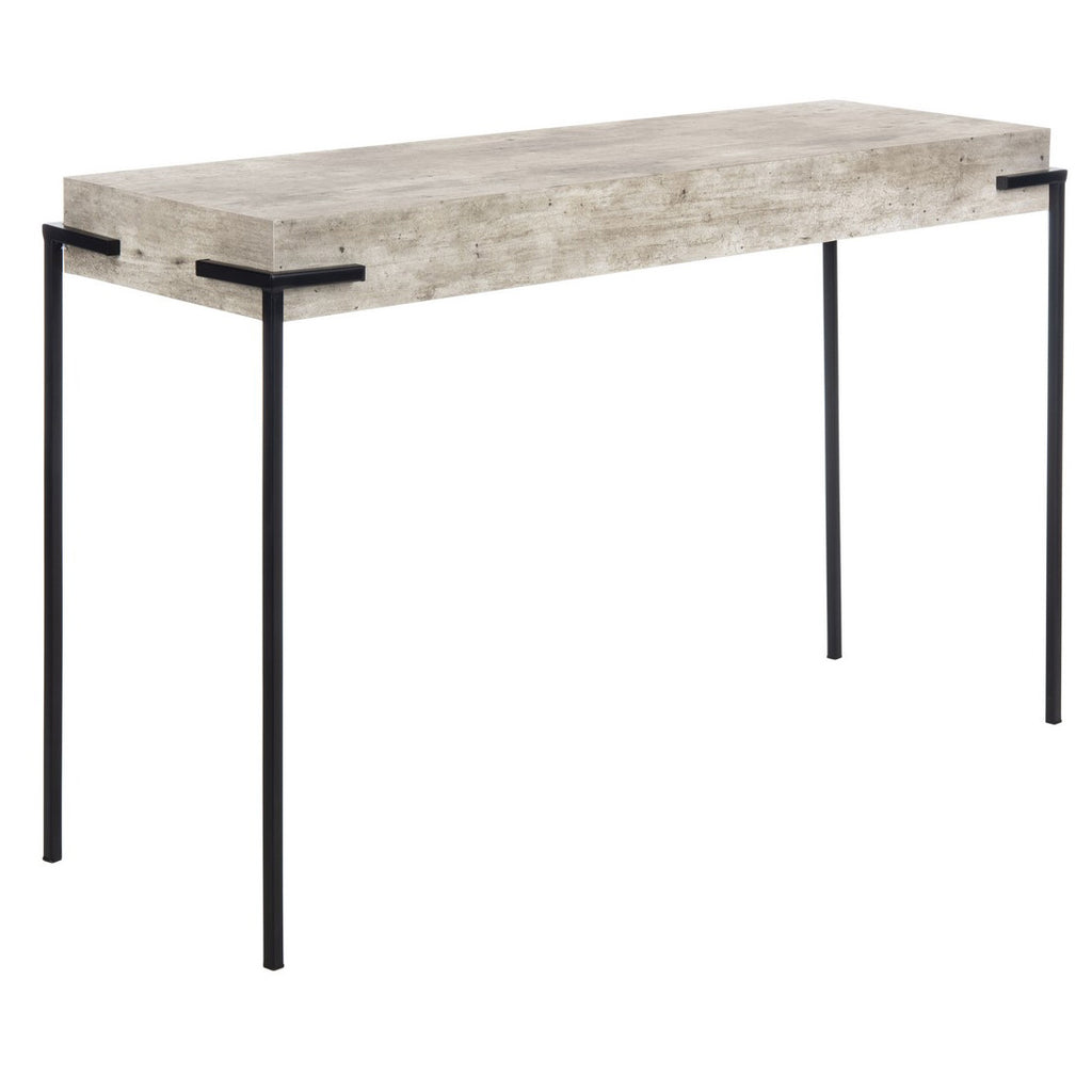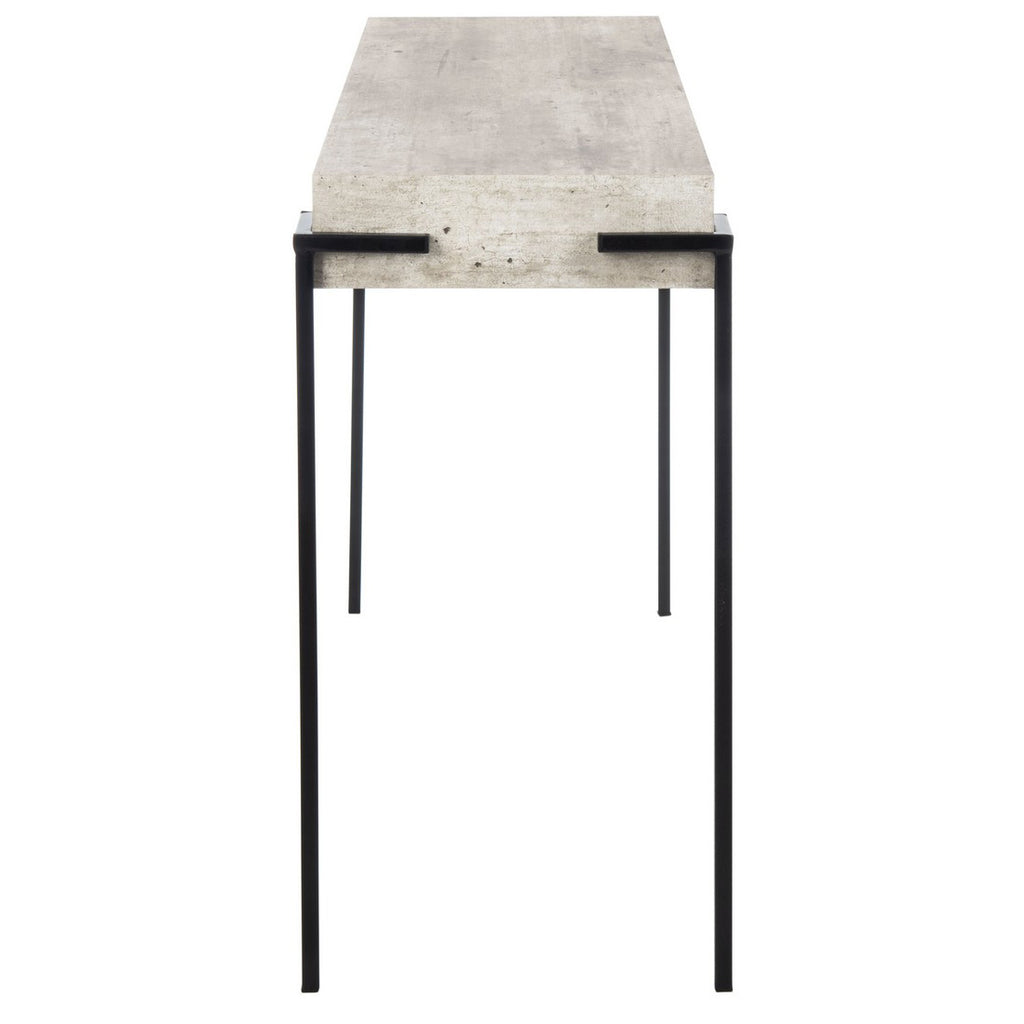 Graciously elevated on slender black iron legs, this sculptural contemporary rectangle console table is a work of art. Designed to curate precious objects, its finely crafted Light Grey and Black wood top blends seamlessly into any entry or living room.