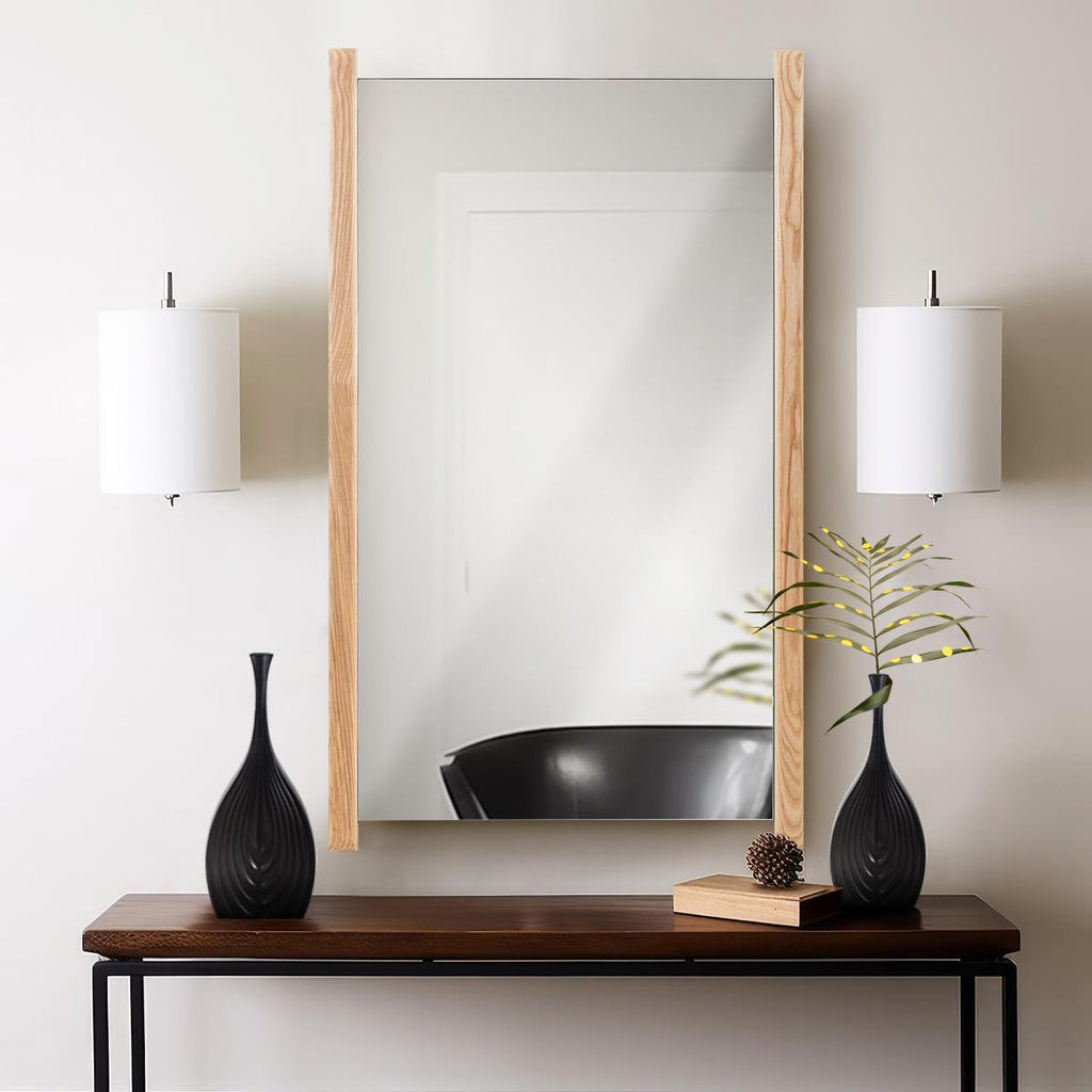 The wooden side frames lend a touch of natural warmth and texture, creating a perfect juxtaposition with the frameless top and bottom edges. This innovative design not only adds visual interest but also allows the mirror to seamlessly integrate into a wide range of decor styles. Whether hung individually as statement pieces or grouped together to form an eye-catching composition, our Emil vanity mirror invites you to explore the fusion of materials and aesthetics, providing a timeless and adaptable solution for enhancing your living space.