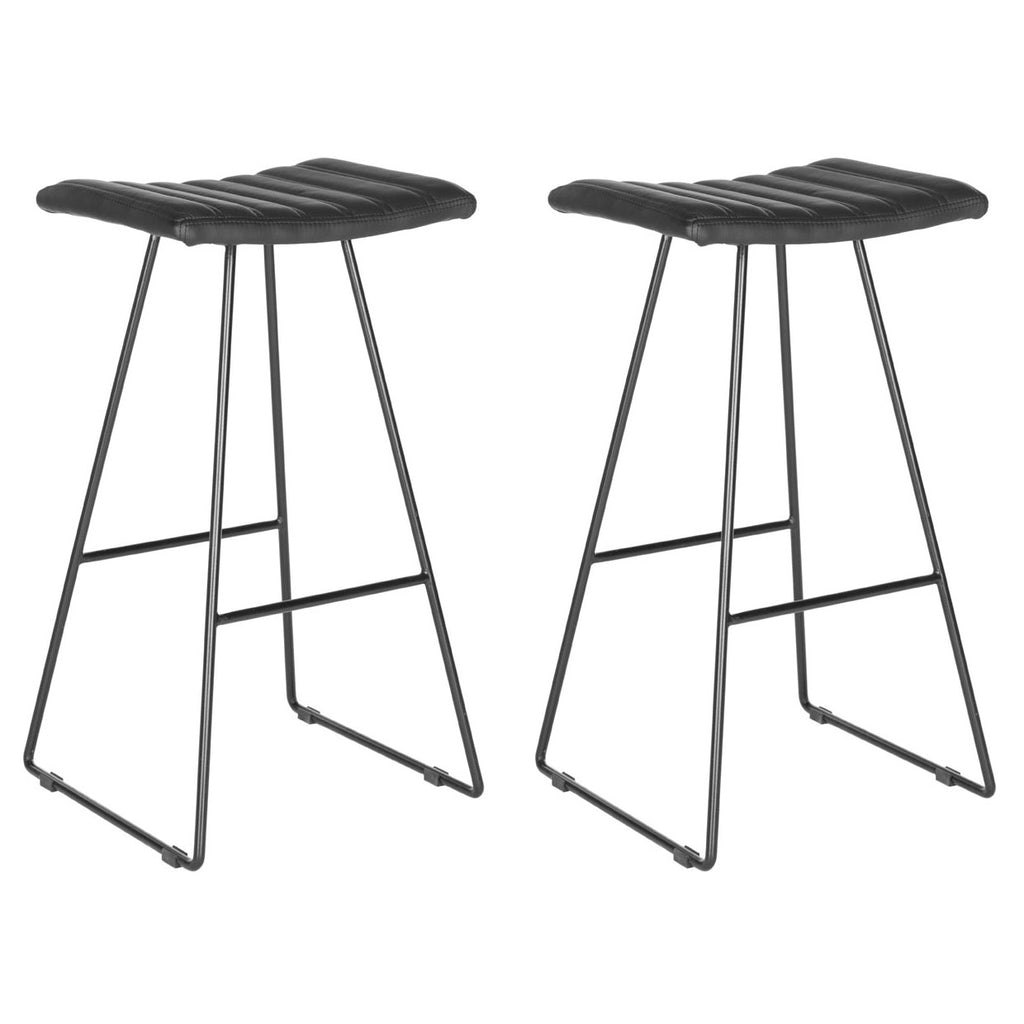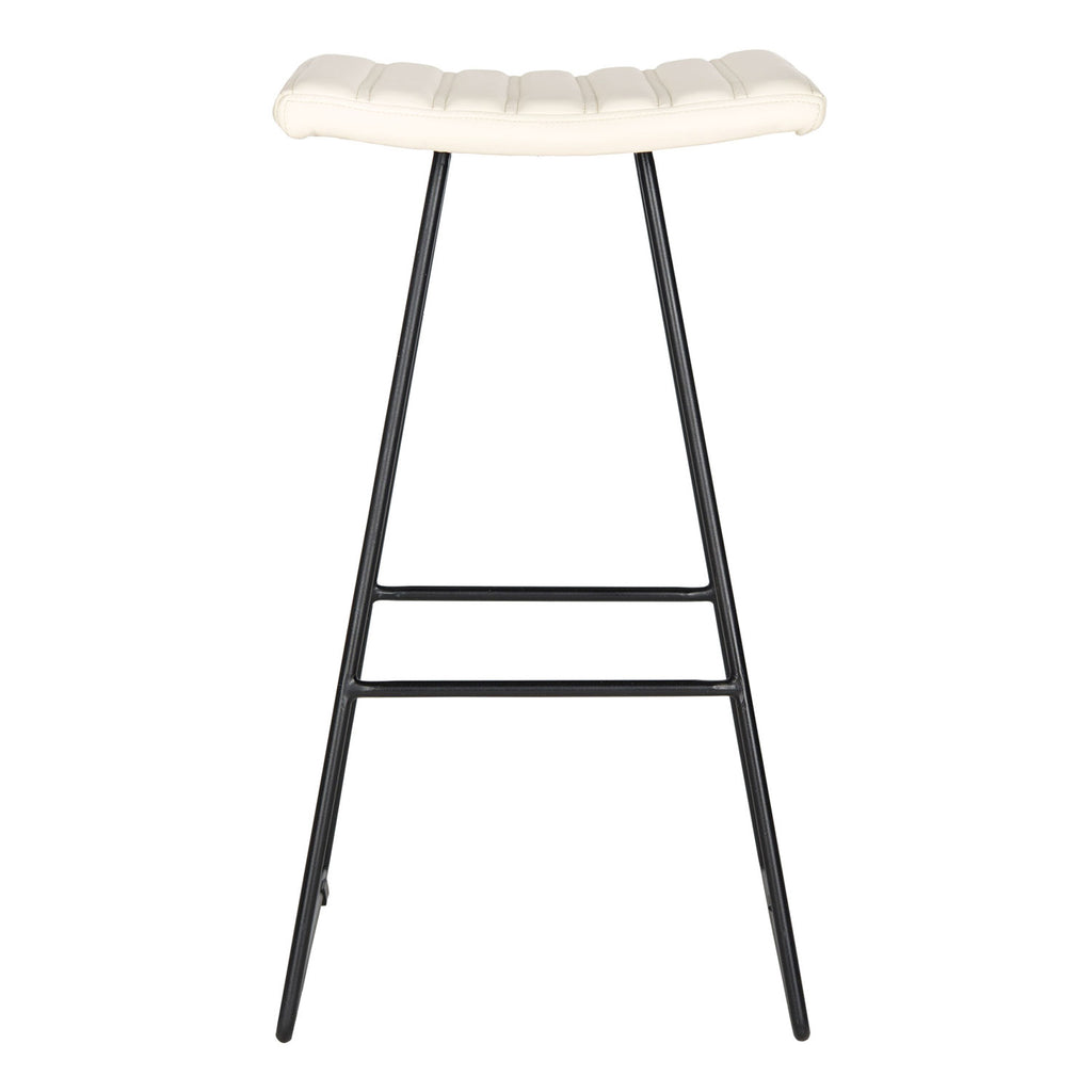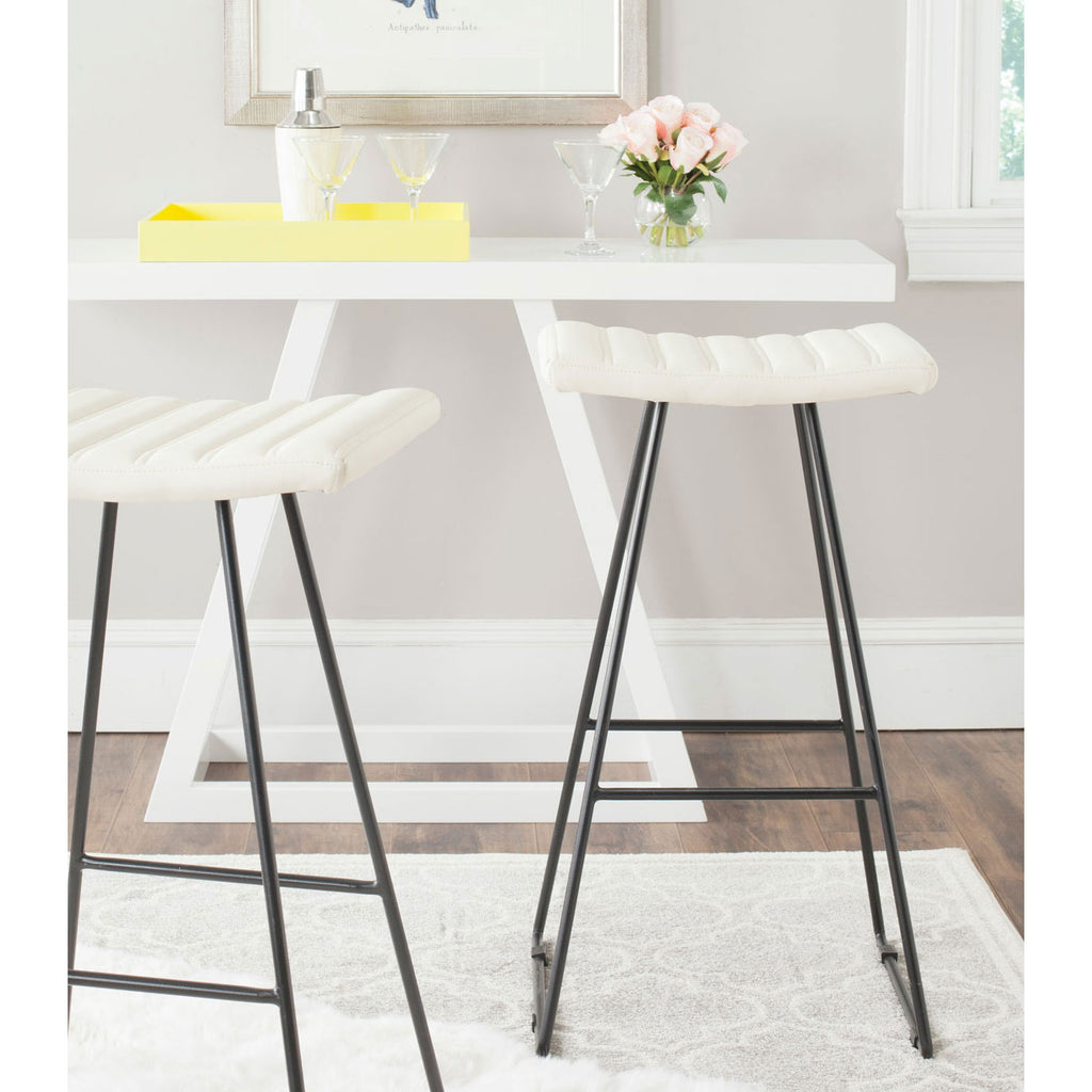 Raise the bar for style in the kitchen or family room with the airy look and clean silhouette of the this bar stool. A comfy channel-quilted seat of cream, black or gray PU leather rests atop a whisper thin A-line frame of iron supported by sturdy crossbars. Sold as set of 2.
