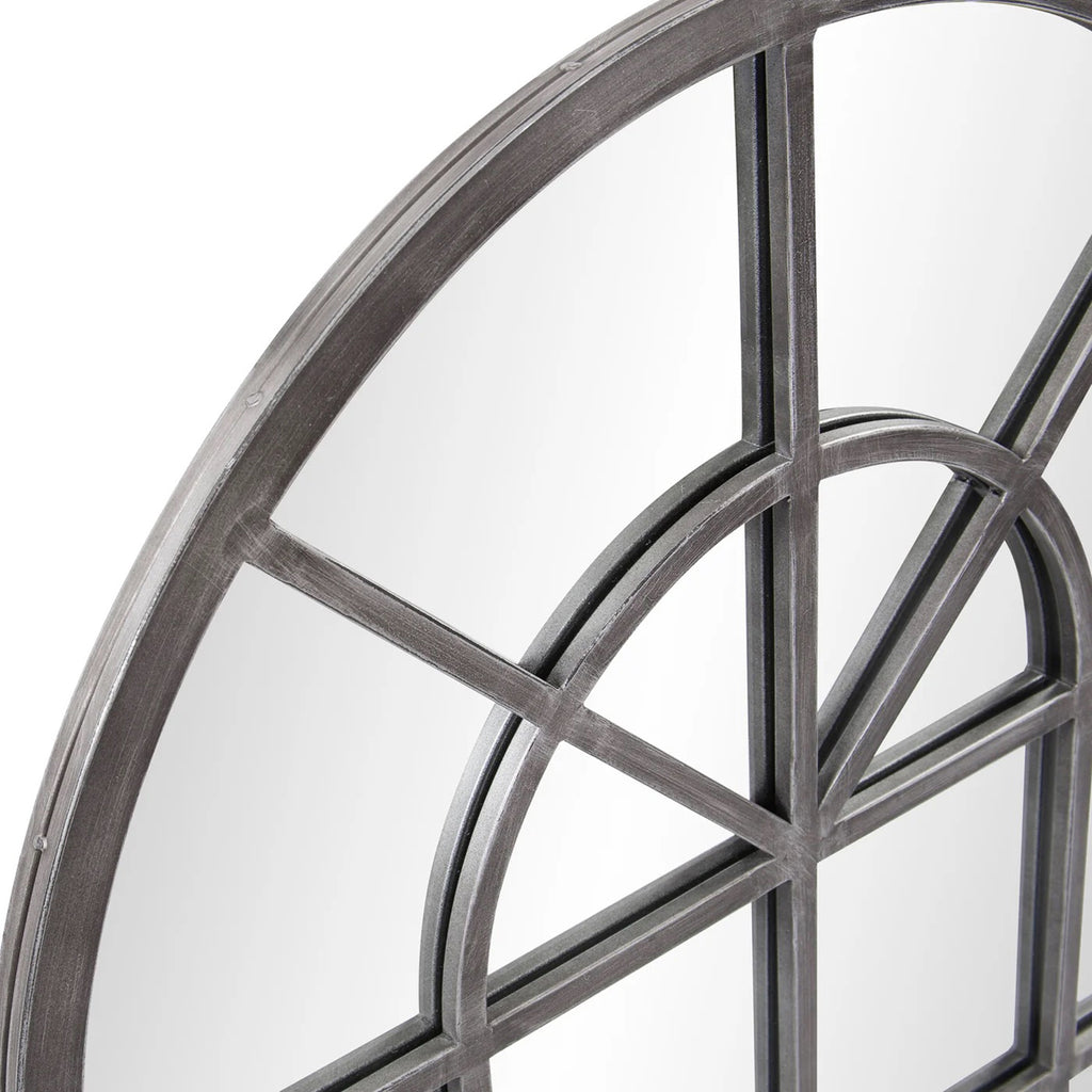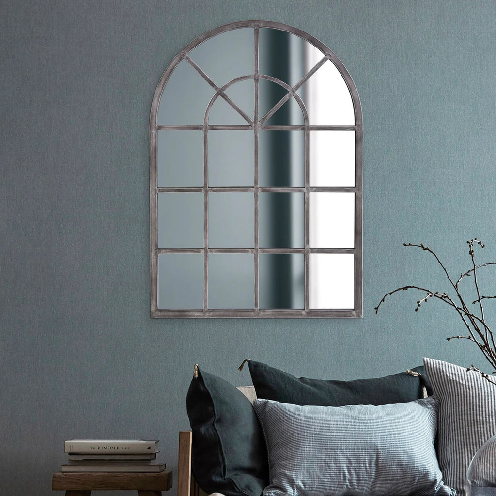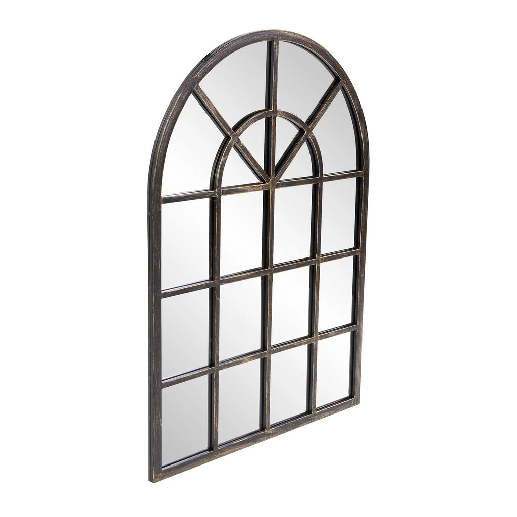 The Fenetre Mirror is a great piece because it resembles an arched window; complete with sectioned window panes. The wood frame is finished in a lacquer that has distressed accents making it perfectly fit into your Shabby Chic or Cottage-esque decor. It is a perfect focal point for an entryway, bathroom, bedroom or any room in your home. D-rings are affixed to the back of the mirror so it is ready to hang right out of the box! The mirrored glass on this piece is not beveled.