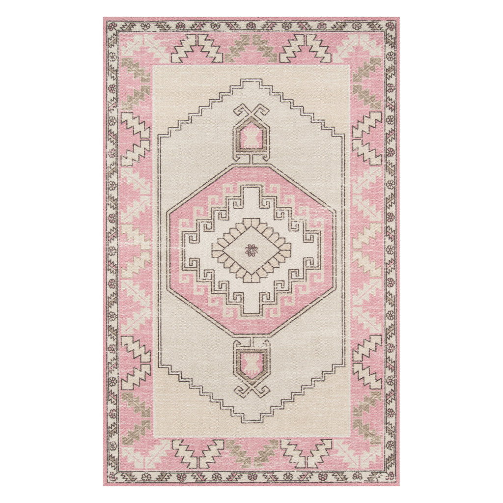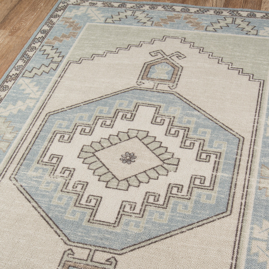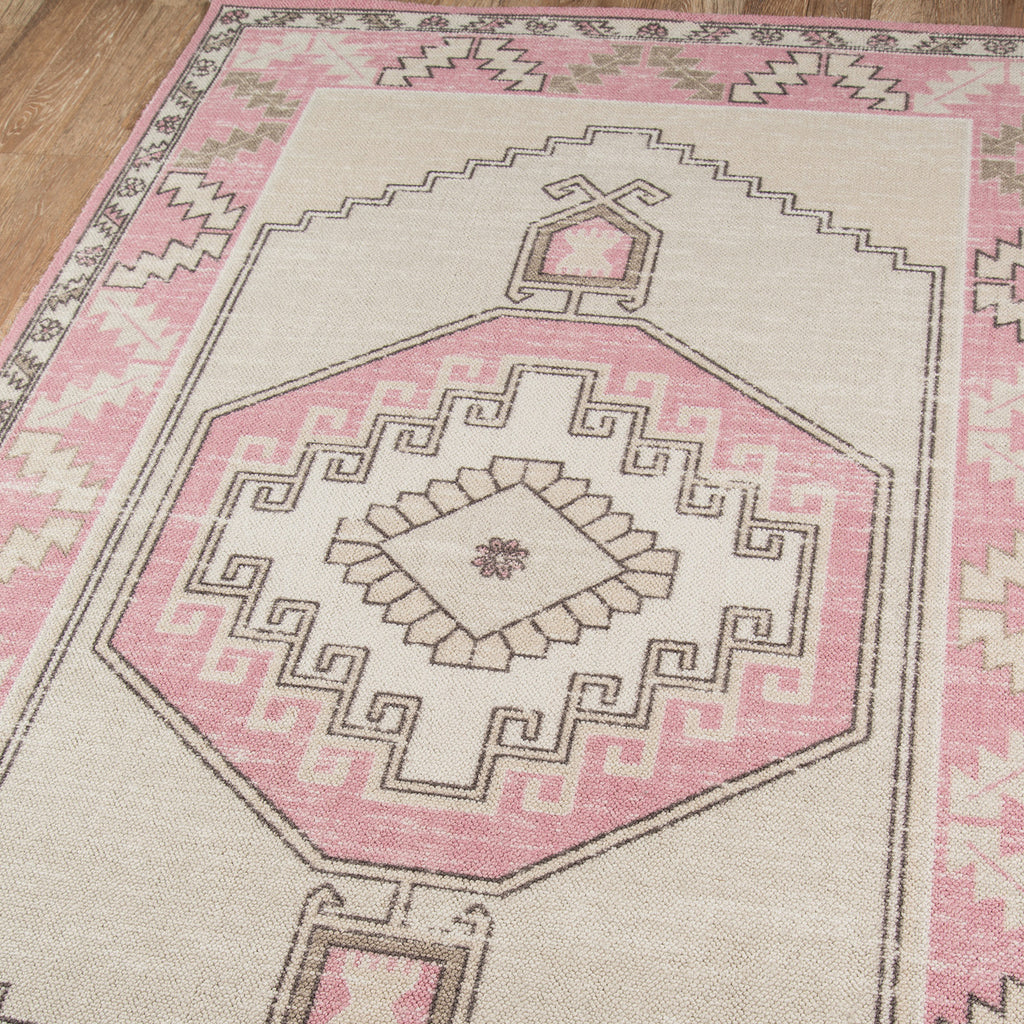 The pastel color palette of the Florence Collection presents the softer side of tribal style. Subdued shades of pink, baby blue and brown fill the field and ornamental rug borders with classical medallions and vine and dot motifs. Crafted in an innovative combination of natural wool and nylon threads, modern machining mimics ancestral weaving techniques to create a series of chic floor coverings that are superior in beauty and performance.