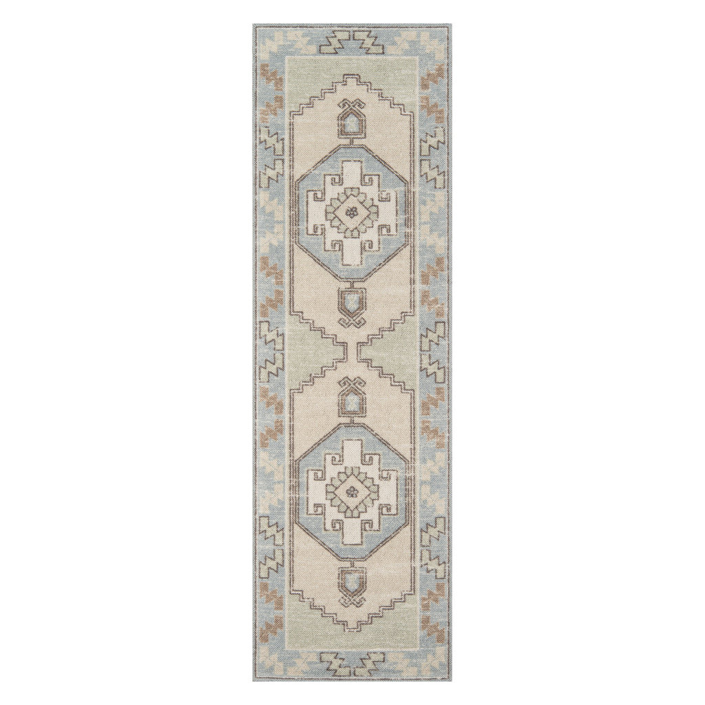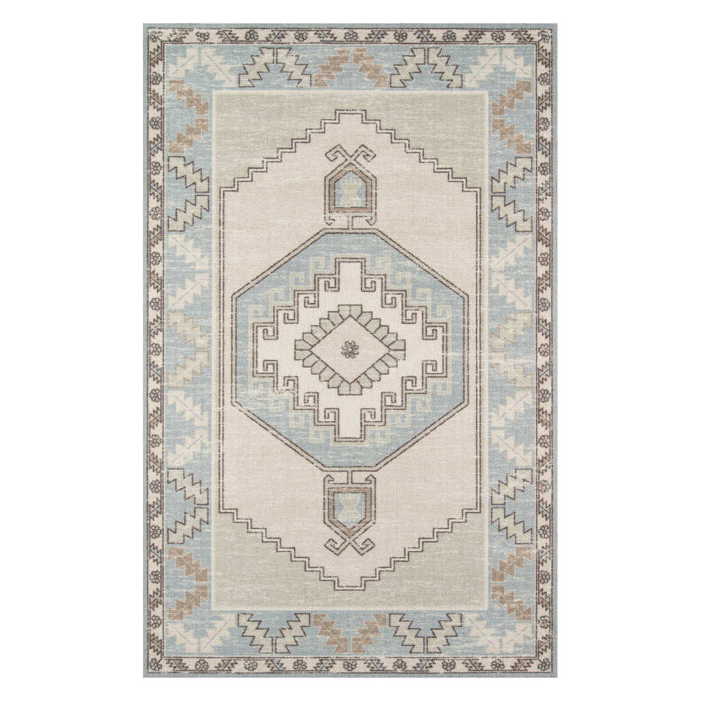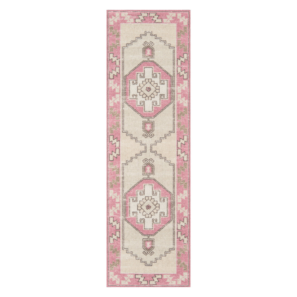 The pastel color palette of the Florence Collection presents the softer side of tribal style. Subdued shades of pink, baby blue and brown fill the field and ornamental rug borders with classical medallions and vine and dot motifs. Crafted in an innovative combination of natural wool and nylon threads, modern machining mimics ancestral weaving techniques to create a series of chic floor coverings that are superior in beauty and performance.