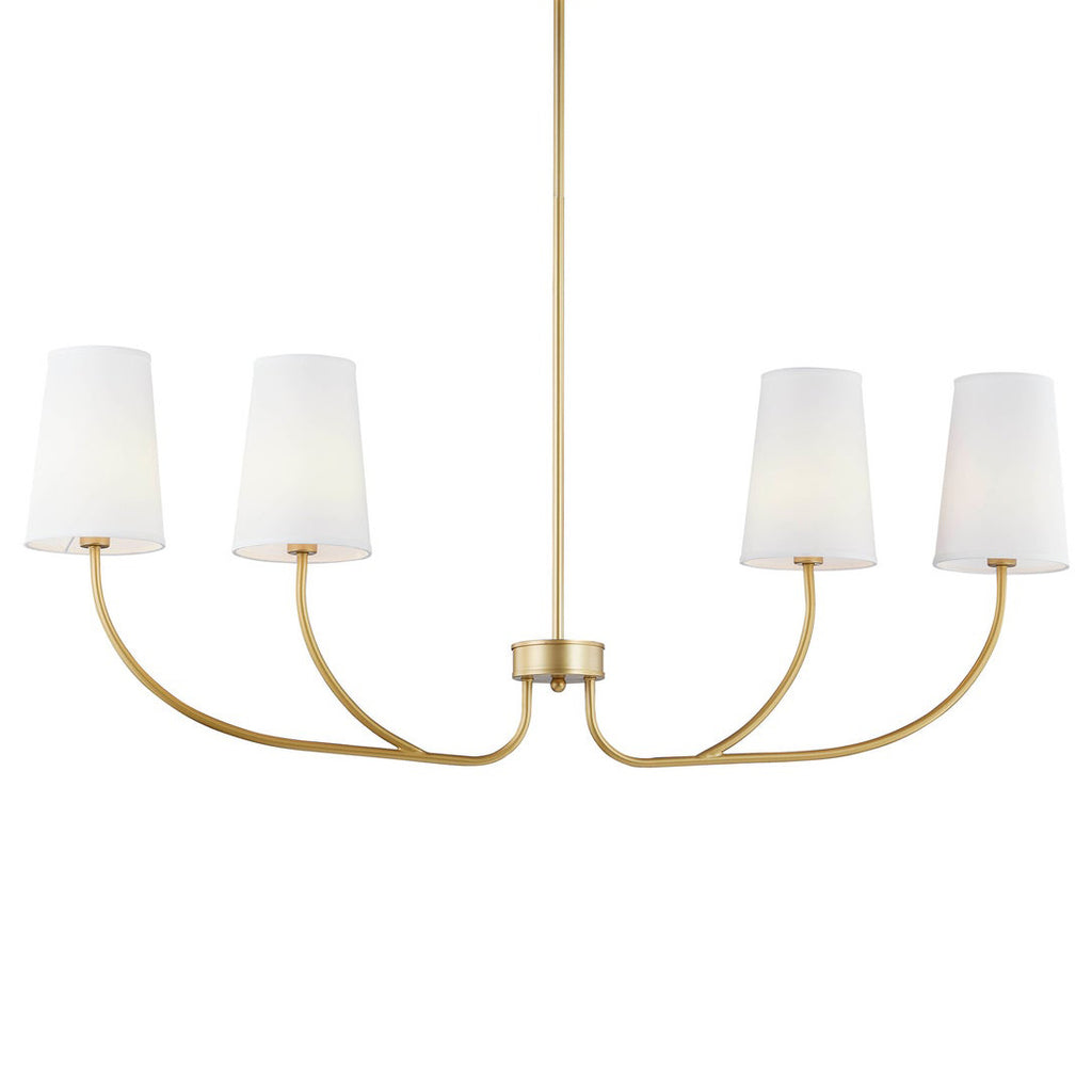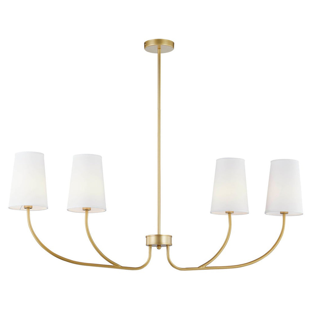 The 4-light Forty West Designs Eden Chandelier has a beautiful gold finish. A minimal linear design with traditional elements, four beautiful fabric shades and subtle curves soften this look. Perfect for island and long dining tables.