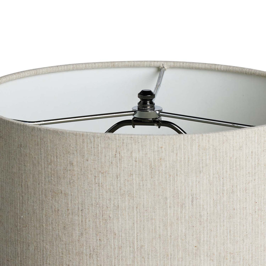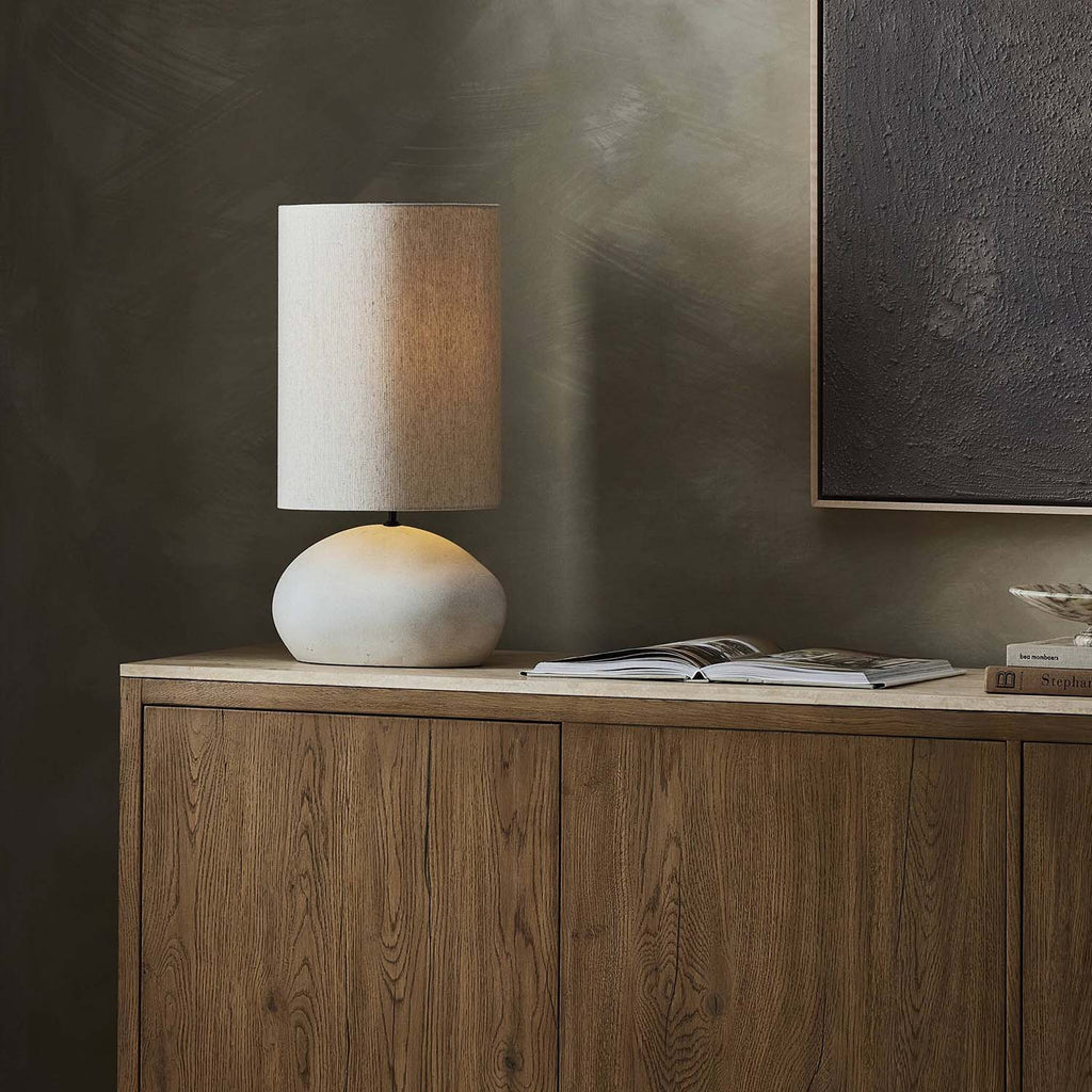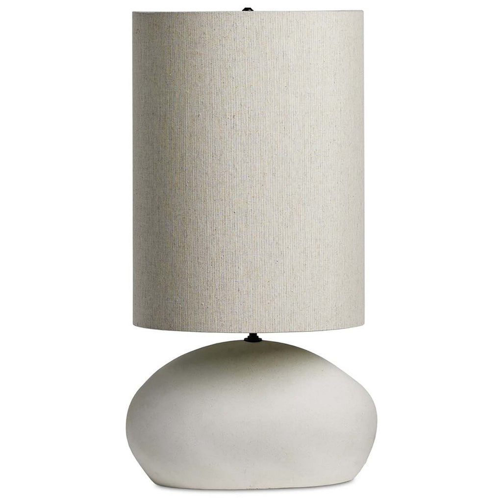 A curved ceramic base with a speckled matte finish supports an extra-tall flax linen shade. This elongated silhouette brings a sculptural look to any tabletop.