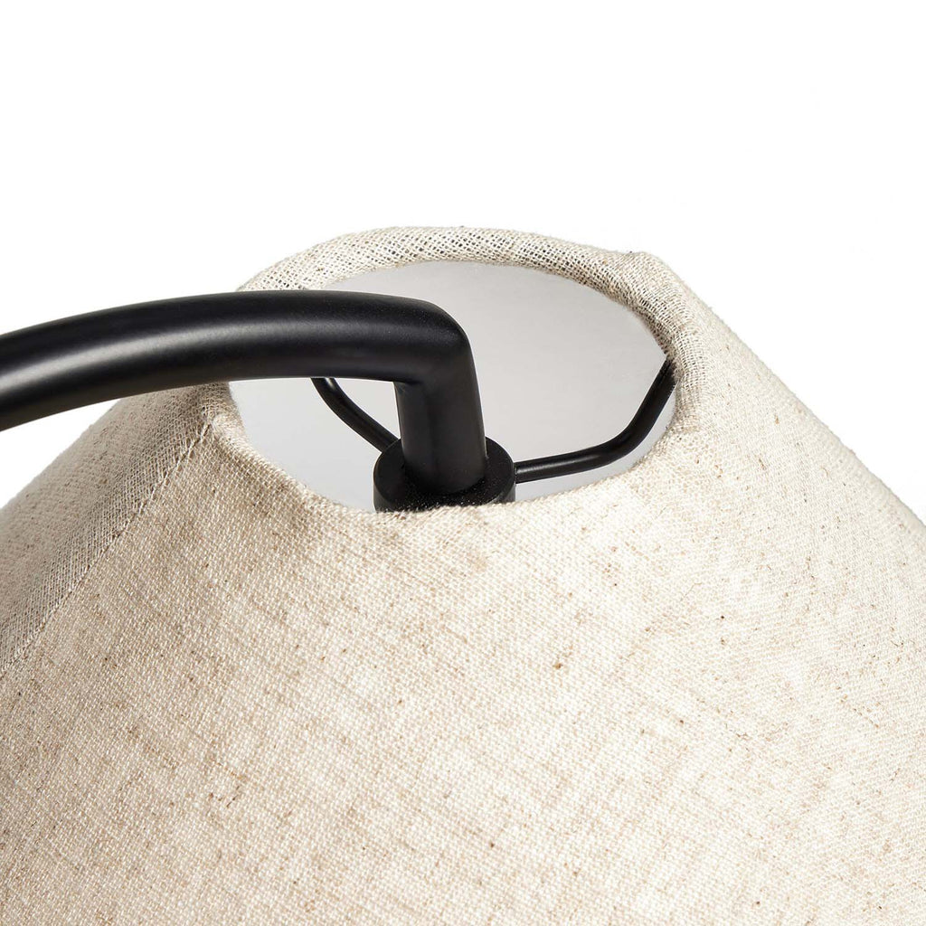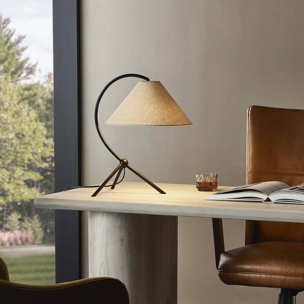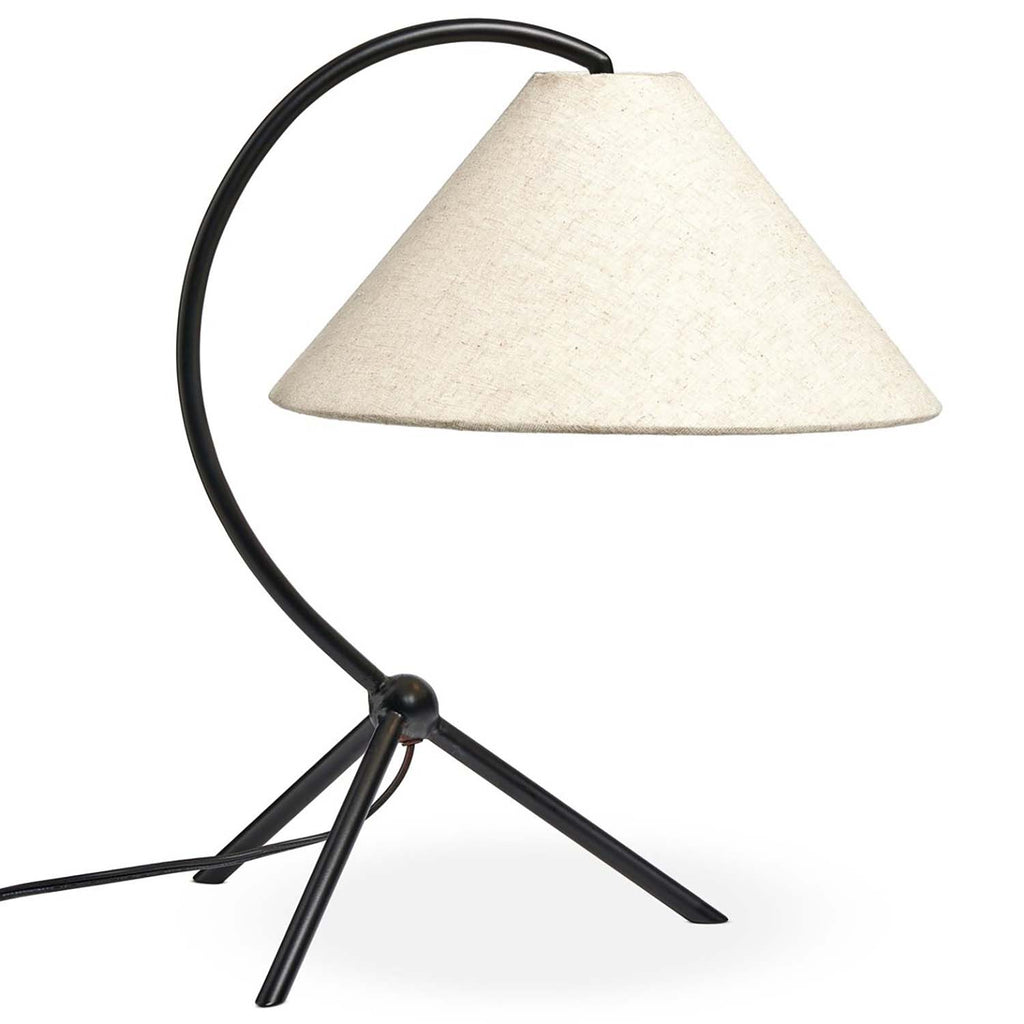 A dramatically curved silhouette and tripod base of matte black metal pair with a flax linen shade for a shapely, minimalist feel.
