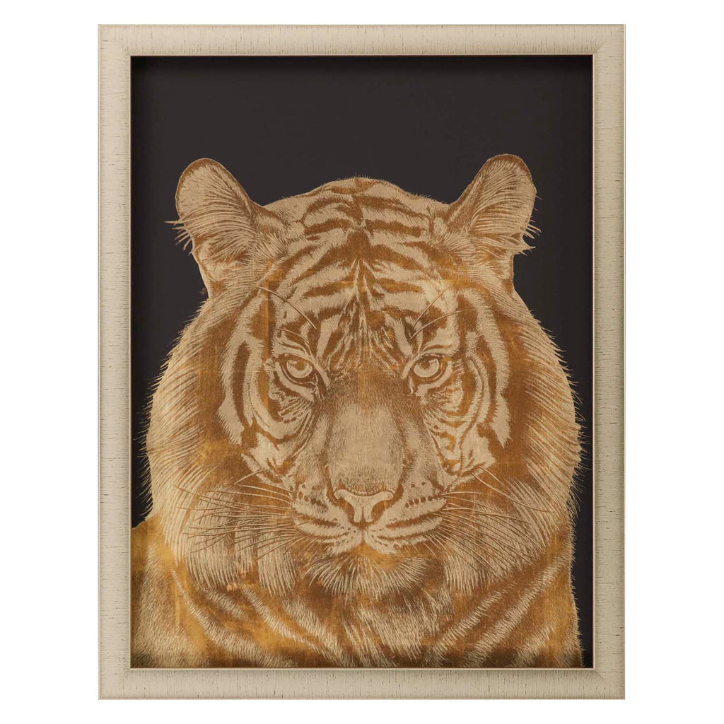 A dramatic tiger is framed in a champagne gold block contemporary molding.