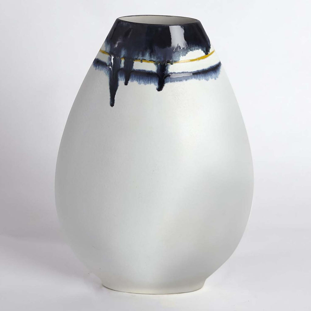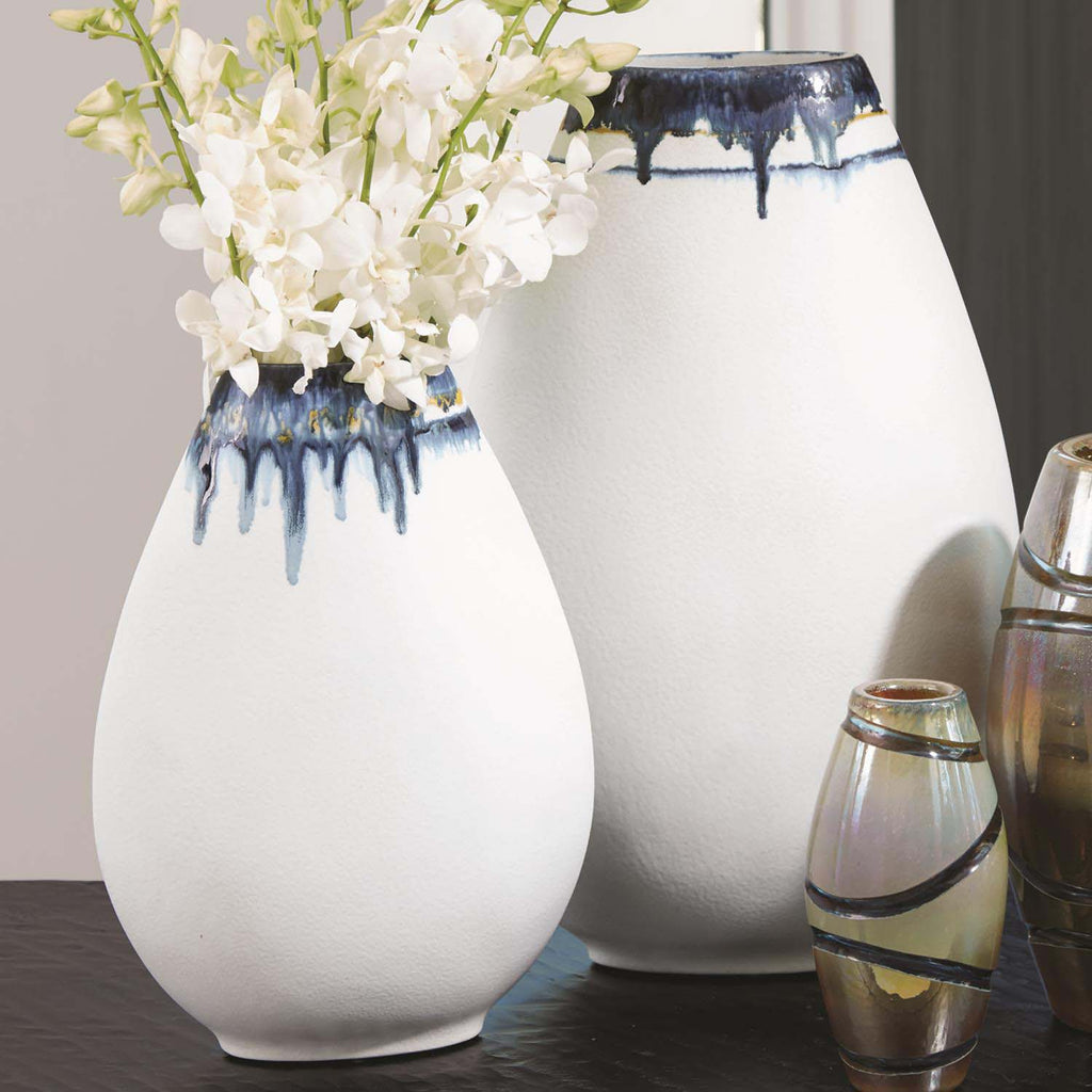 Global Views Glass Drip vases are made of porcelain with molten glass fragments fired into the cream hued reactive glazed. Hand applied accents of deep blue and solar yellow.