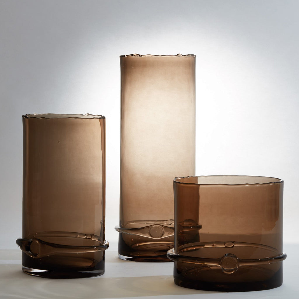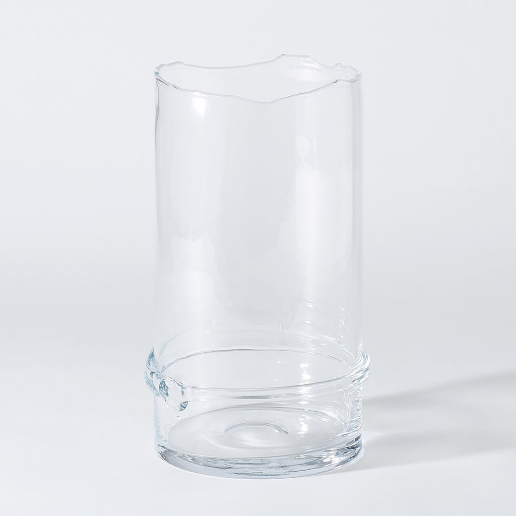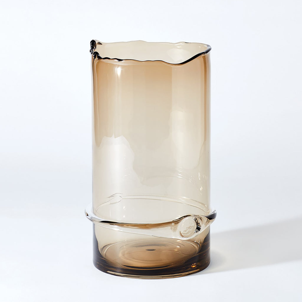 The Global Views Intaglio Collection of beautiful Polish crystalline features a hand-applied glass ribbon near the base with an intaglio or stylized seal in the center. An irregularly shaped rim is another unique detail of the collection. Available in Clear and Topaz.