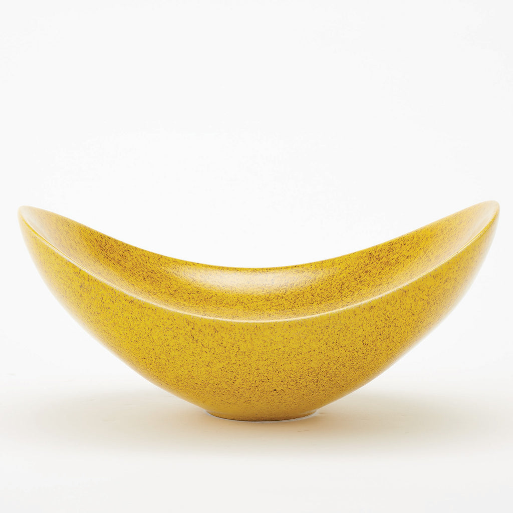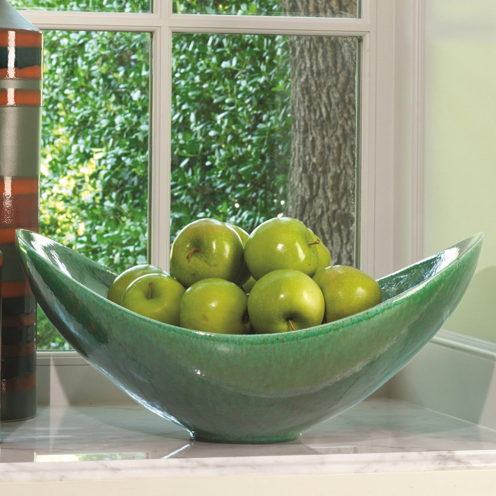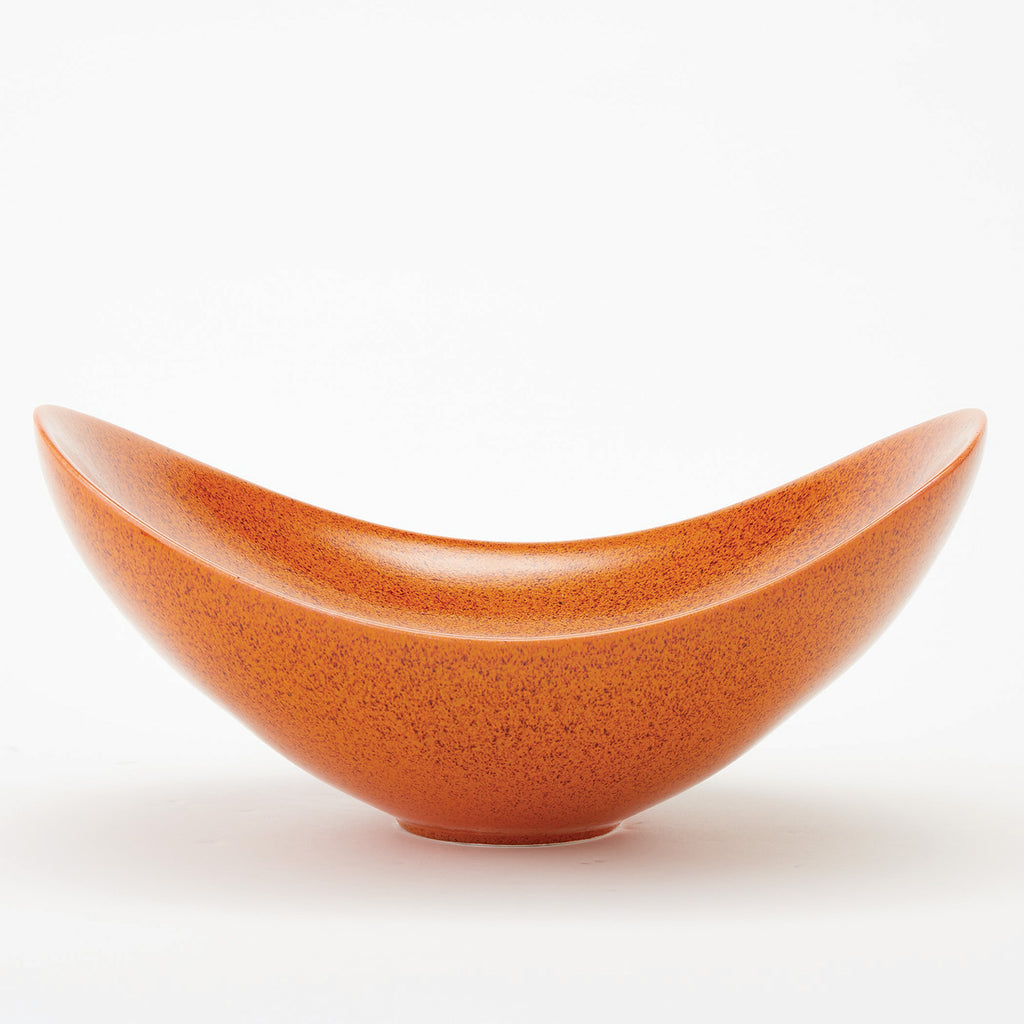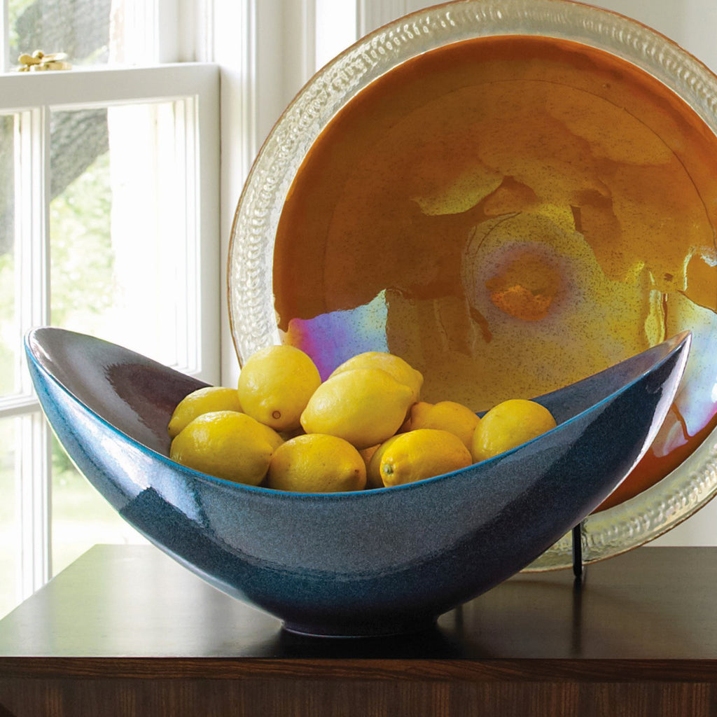 The dramatic silhouettes of the Global Views Swoop Bowl are extremely difficult to achieve on this scale, but the results are stunning. The height, proportion, and negative space of the ring vases lend to the overall impact of these unique pieces. Available in Celestial, Emerald, or Orange. Made with a reactive glaze.