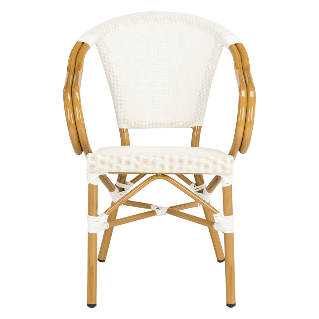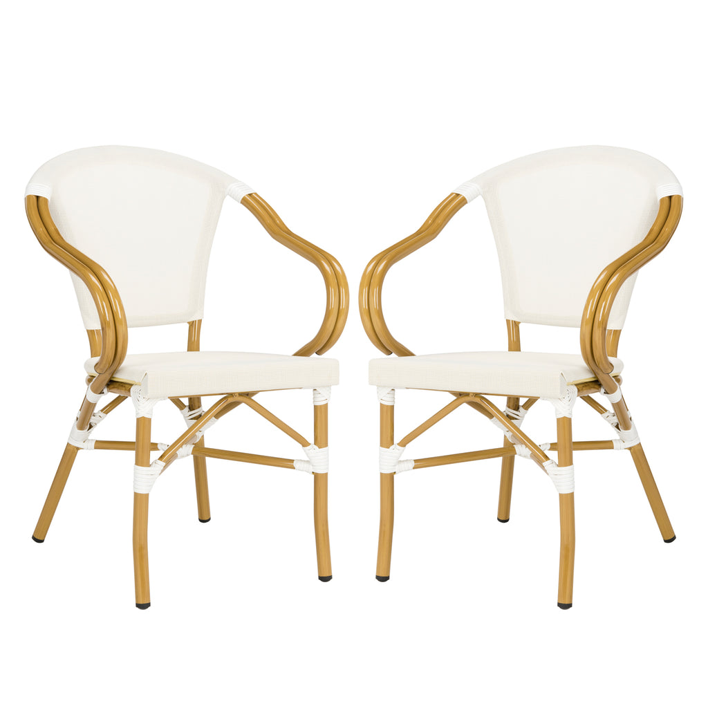 Inspired by the classic bamboo peacock chair, this set of two Gulf arm chairs is treated to state of the art materials for outdoor use. Crafted with aluminum frame and beige Textilene fabric, this easy care design is pretty and practical.