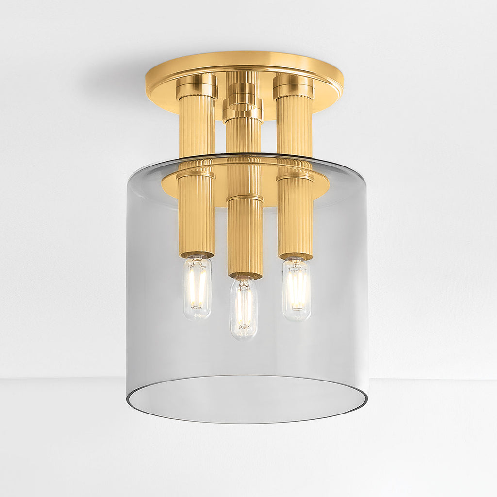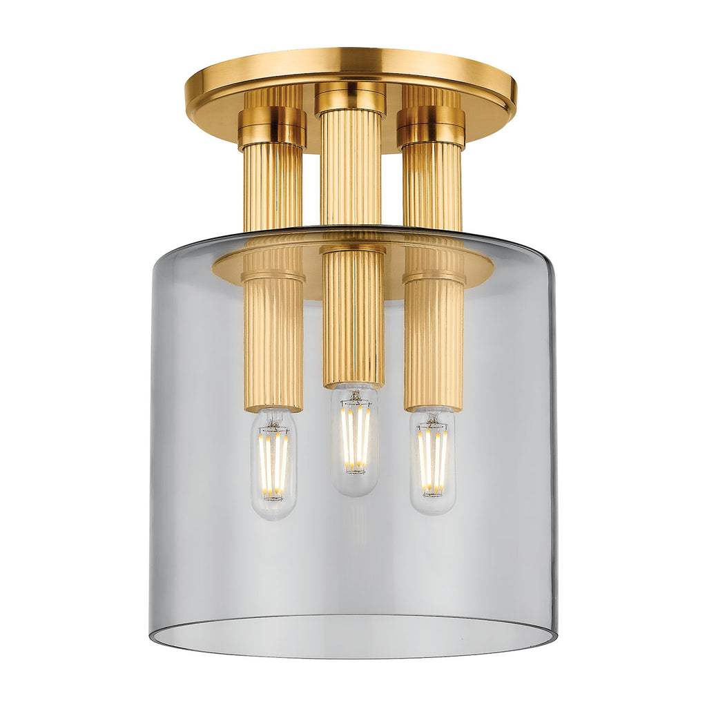 Renowned for built-to-last quality with a timeless feel, Hudson Valley offers a modern lighting collection with elegant touches, recalling vintage inspiration. Modern meets rustic in this nautical-inspired flush mount. Leaning into the visually tailored sensibilities, the Crystler flush mount features sleek geometries and sophisticated materials. A cluster of elongated socket cups in an Aged Brass finish pierces through a smoke glass shade to create a striking, stylish statement. Whether you opt for 3 or 5 lights, the density of the circular cluster packs a large punch of light into a small amount of space.