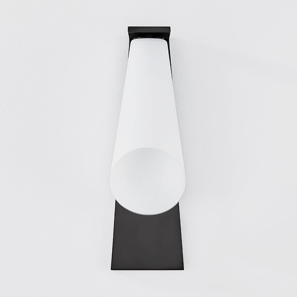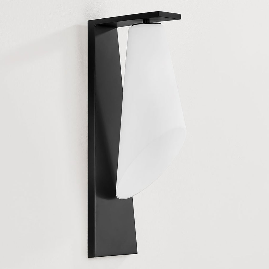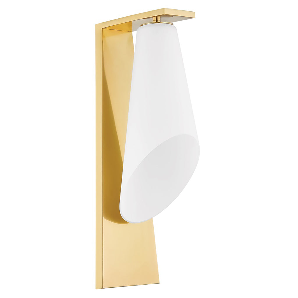Sharp angles, sinuous curves, and sleek metalwork come together in the architectural Hudson Valley Lighting Andros sconce. Suspended from an L-shaped backplate, the modern conical silhouette has a bell-like appearance. The opal matte glass shade is bias-cut on the end to create an elliptical opening, projecting light outwards into the room. Choose from either an Aged Brass or Old Bronze backplate for a more classic or modern look.