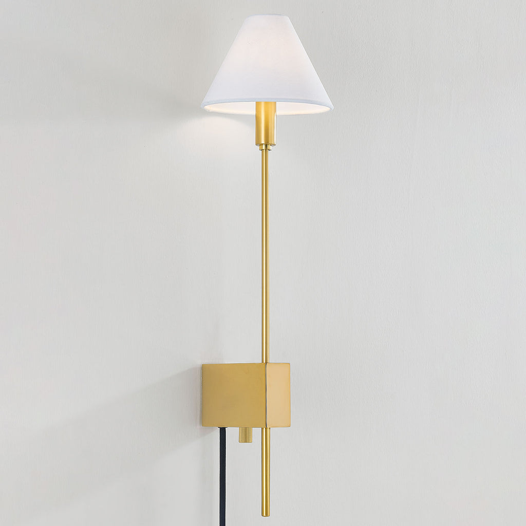 Renowned for built-to-last quality with a timeless feel, Hudson Valley offers a modern lighting collection with elegant touches, recalling vintage inspiration. Full of character, this plug-in sconce cleverly plays with proportions. A notably elongated, slender arm in Aged Brass supports a petite tapered white linen shade, exploring linear elegance while maintaining a classic silhouette. Enhancing its functionality, the backplate features a full-range dimmer, allowing for complete customization.