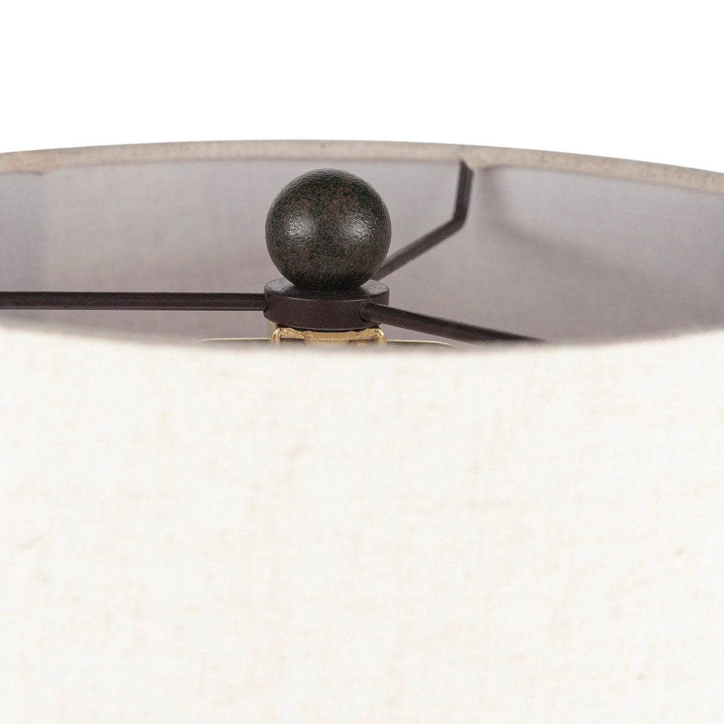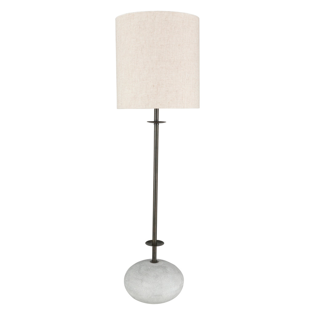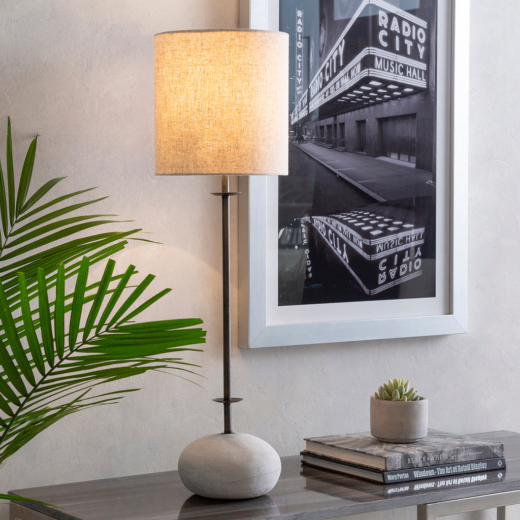 Spice up your living areas with the Hunter lamp. This item is comprised of linen, metal, and stone.