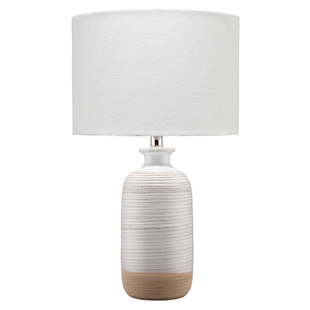 The warm hues and glaze of this textured ceramic table lamp adds visual interest to any space. Handmade of ceramic, the intricate line patterns are highlighted in natural and off-white glaze. Topped with a linen shade for a soft contrast and refined glow.