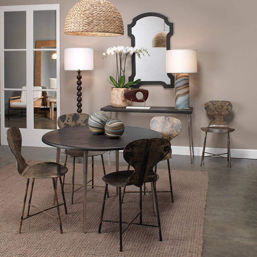A unique chemical reaction is applied to the Jamie Young McCallan molded metal chair making a one-of-a-kind piece perfect for making a statement around any dining table! Each chair will be different because they are handmade. Finish, pattern & shape will vary per piece. No two will be alike.