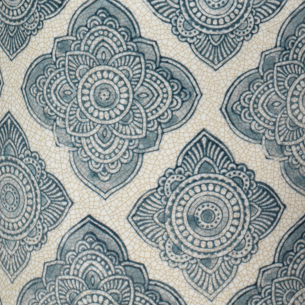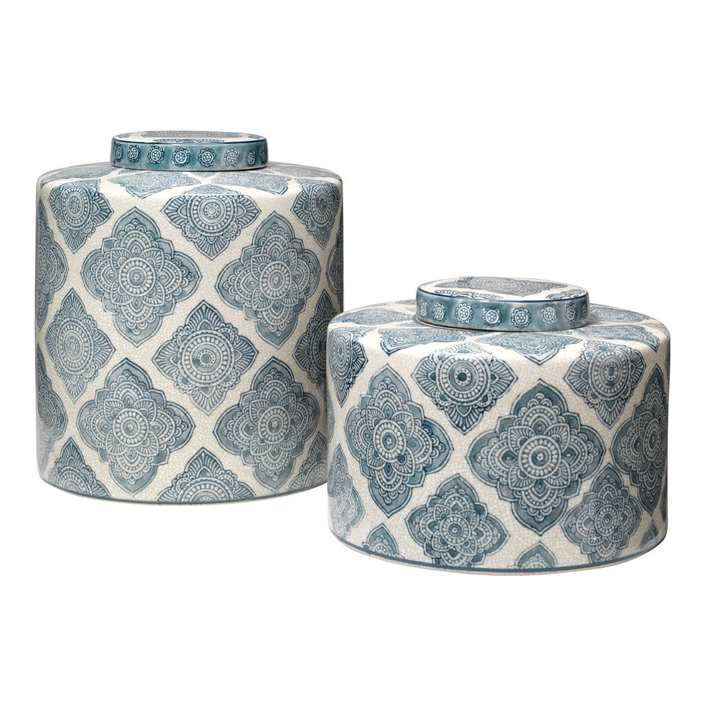 The Jamie Young Oran canister set is a simple contemporary column shape in a sophisticated Arabic indigo pattern, repeated over a bone white porcelain background. Sold as set of 2