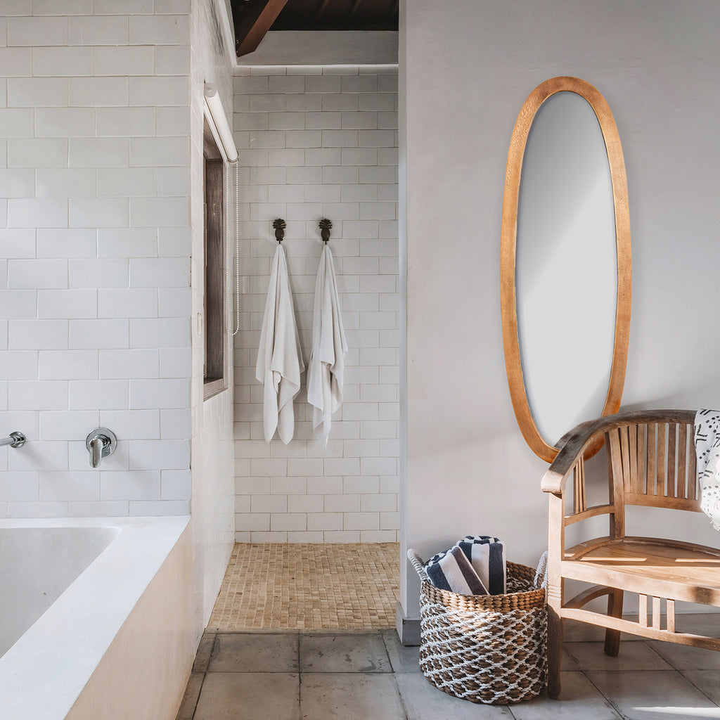 At almost 40 inches high, this mirror is made for the open concept space. In a warm burnished brass finish, it adds a refined look and simple profile
