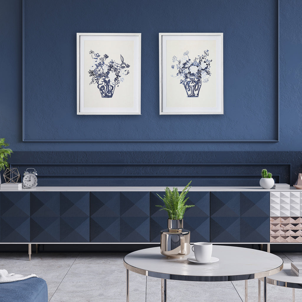 This monochromatic whimsical pair of floral arrangements are a sweet duo. Finished off with a crisp white mat and white pine frames, they are a great choice for bedroom, study or guest bath.