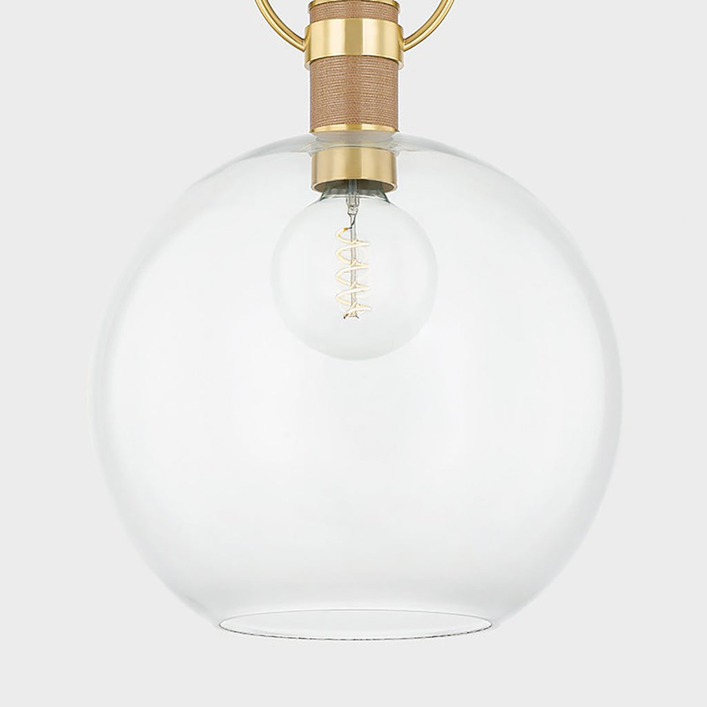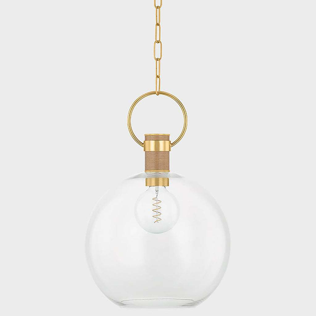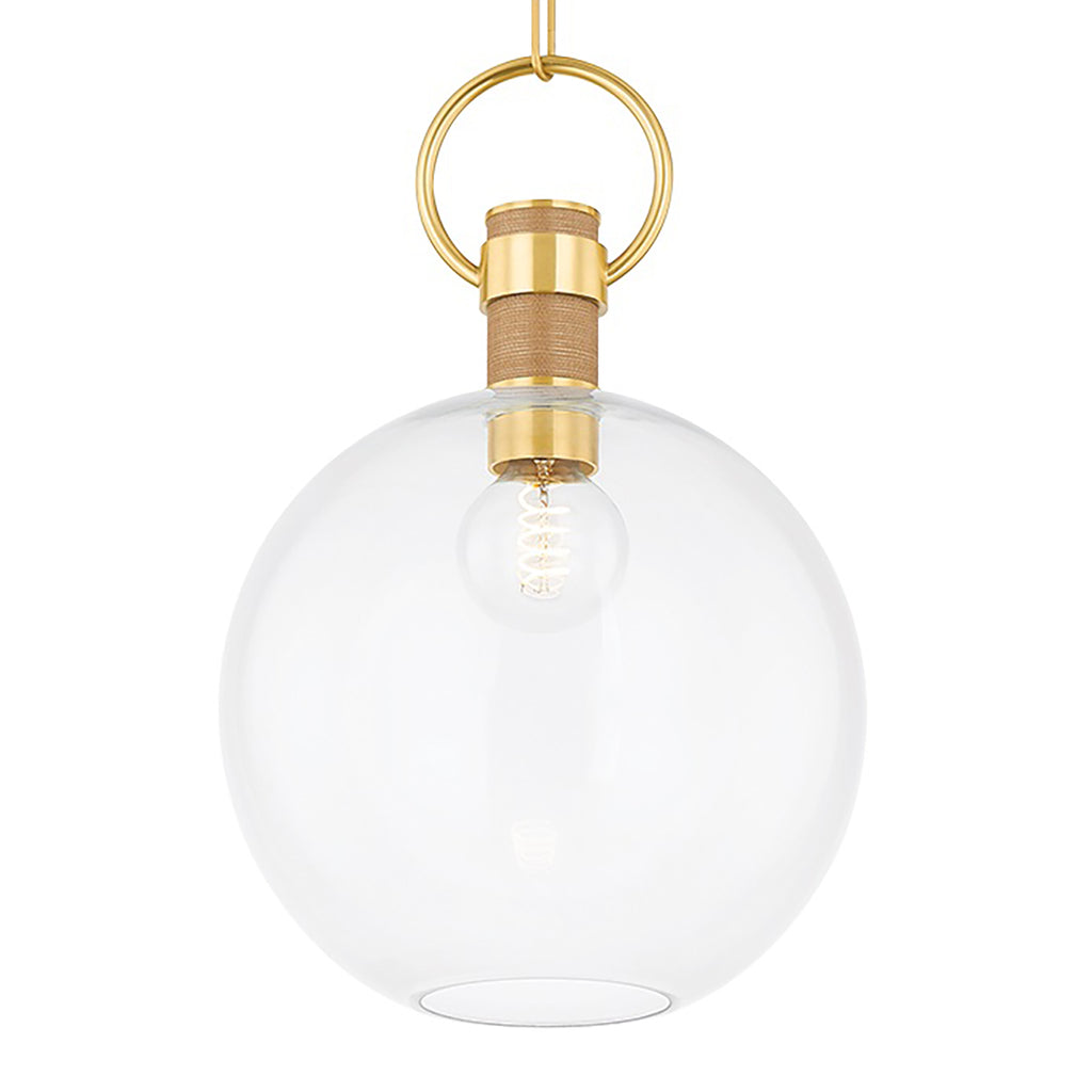 An elevated kitchen basic, Mitzi Catrine Pendant is characterized by uncomplicated forms, industrial design details, and a refreshing blend of materials. This pendant features a large globe suspended by an oversized pin and loop, finished in Aged Brass. To soften the clean lines, grass cloth wraps around the pin, introducing a natural element to the modern silhouette. *Due to the one-of-a-kind nature of the medium, exact colors and patterns may vary slightly from the image shown.