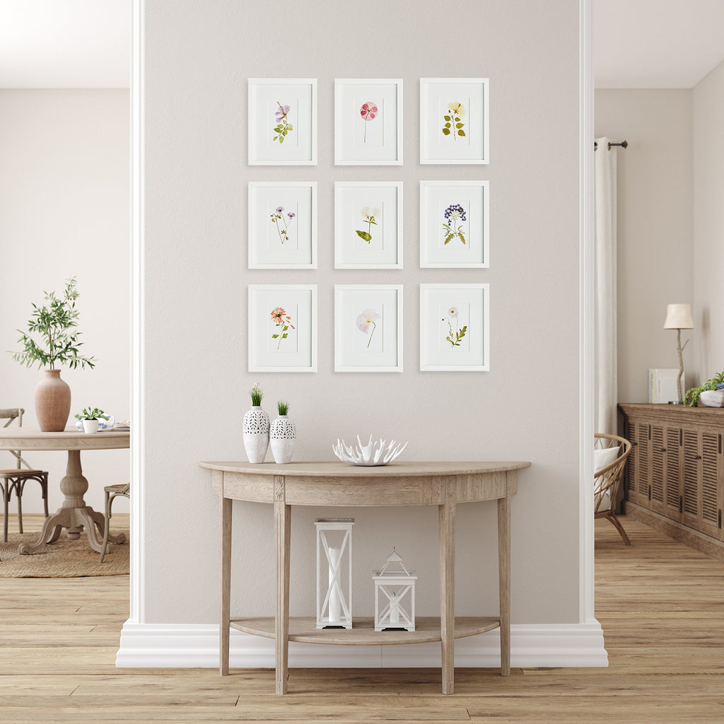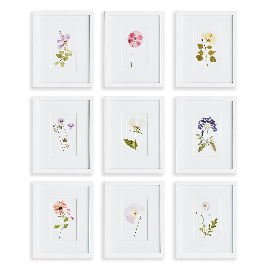 These petite pressed mountain flower prints are a versatile set. Finished with a simple white frame, they work beautifully as a set, but can also be separated and tucked in among books on a bookshelf, or hung in sets of 2 or 3 for a powder room or narrow hallway.
