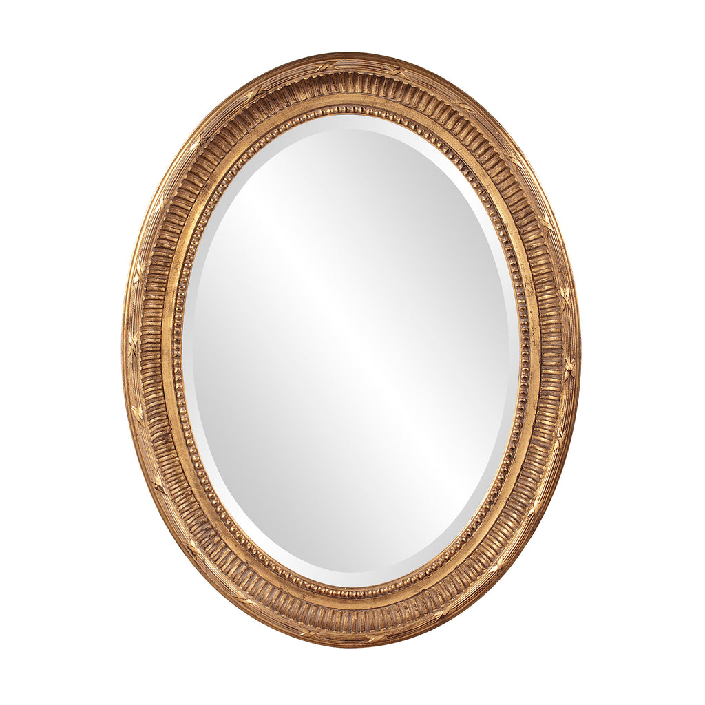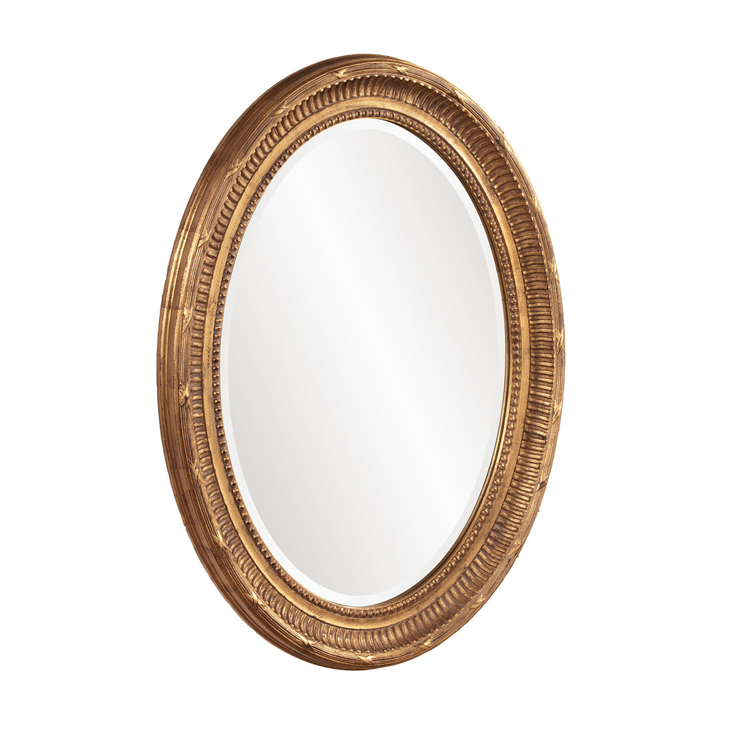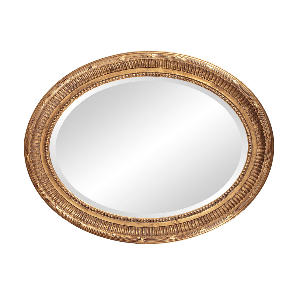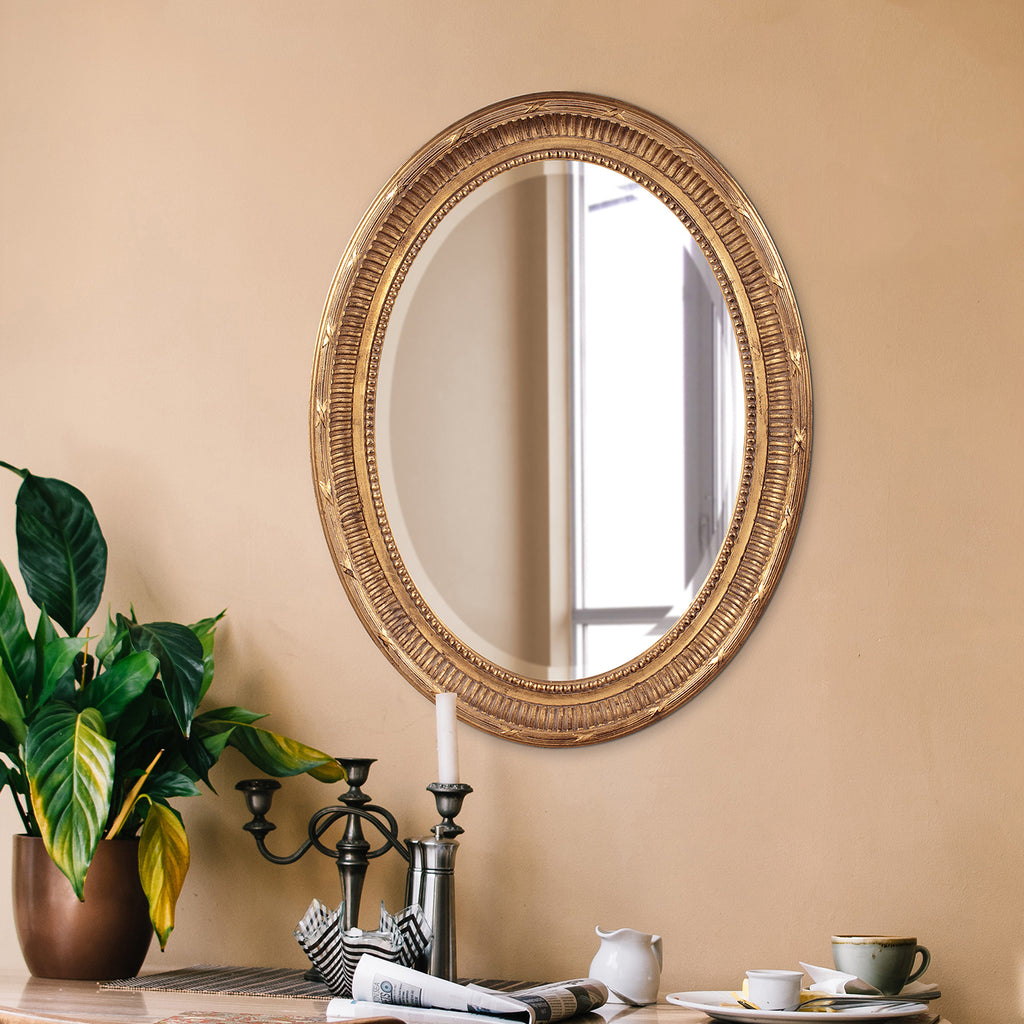 The Nero Mirror features a rich country gold finish. The oval frame is accented with grooves and a ribbed center for added depth and character. The mirror on this piece is beveled adding to its style and beauty. Its Transitional style makes this mirror a favorite for bringing some flair to your decor. This simple yet stunning piece would be a great addition to any room. It is a perfect focal point for an entryway, bathroom, bedroom or any room in your home. D-rings are affixed to the back of the mirror so it is ready to hang right out of the box in either a horizontal or vertical orientation!