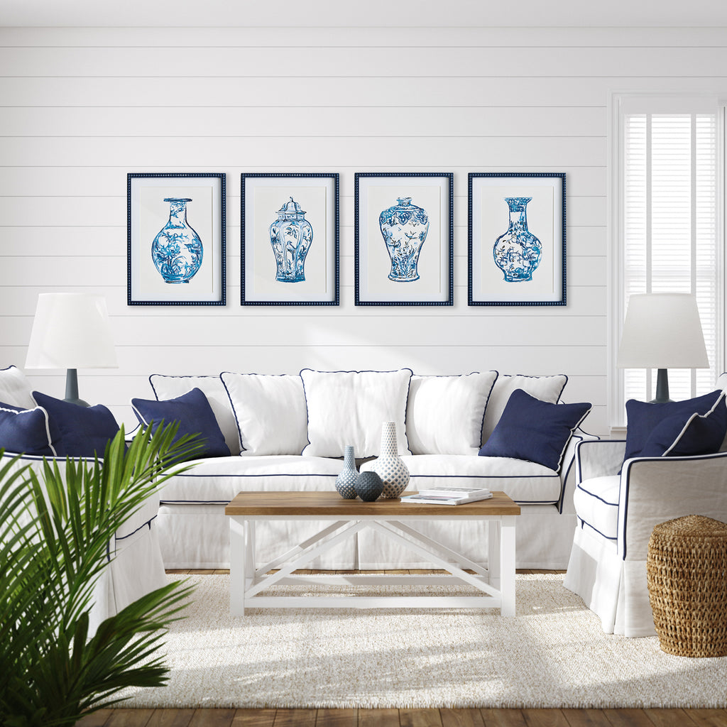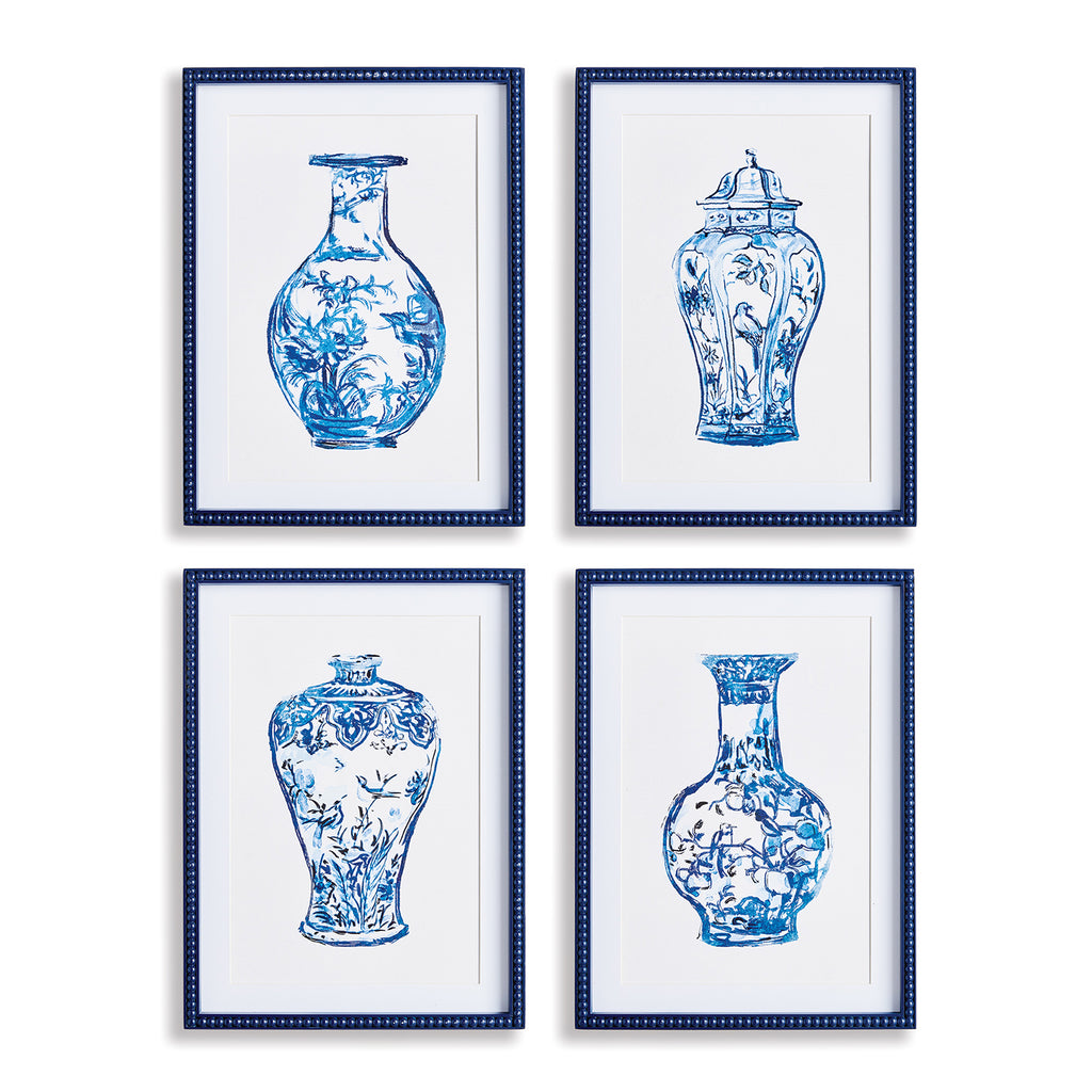 These sweet little chinoiserie ginger jar prints are a versatile set. The simple shape and artistry of traditional patterns are a delight. Tuck them into a bookshelf wall, in a kitchen nook or study. Finished off nicely with a rich blue beaded wood frame.
