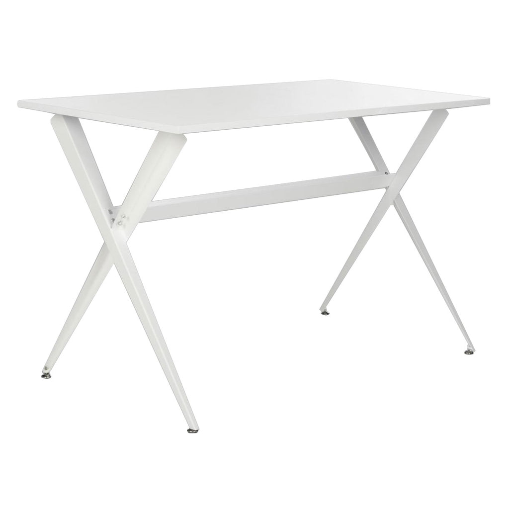 The light and airy silhouette of the white desk is a modern update of classic picnic and refectory tables. Its top appears to float on chic tapered crossed legs, and this sophisticated desk is finished in a sleek lacquer look finish.