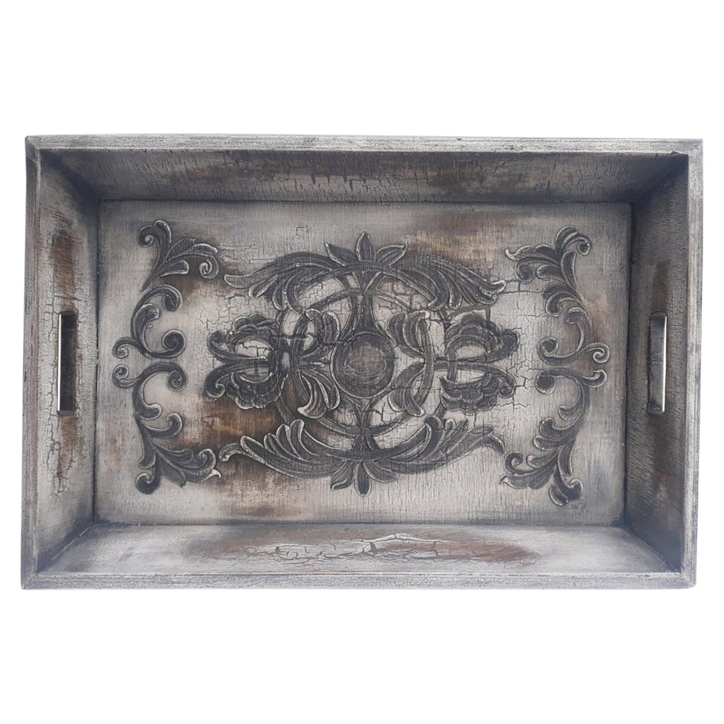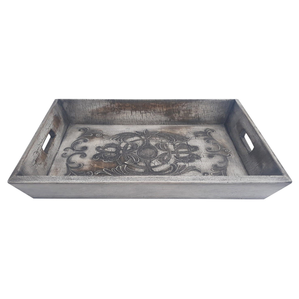 Clean lines and simple design juxtapose with a traditional paint design that involves hand applied textured medallion in the center of this stunning tray. Created for those that appreciate old world flair, this well constructed piece made in solid wood will captivate your interest in adding style to your living surroundings.