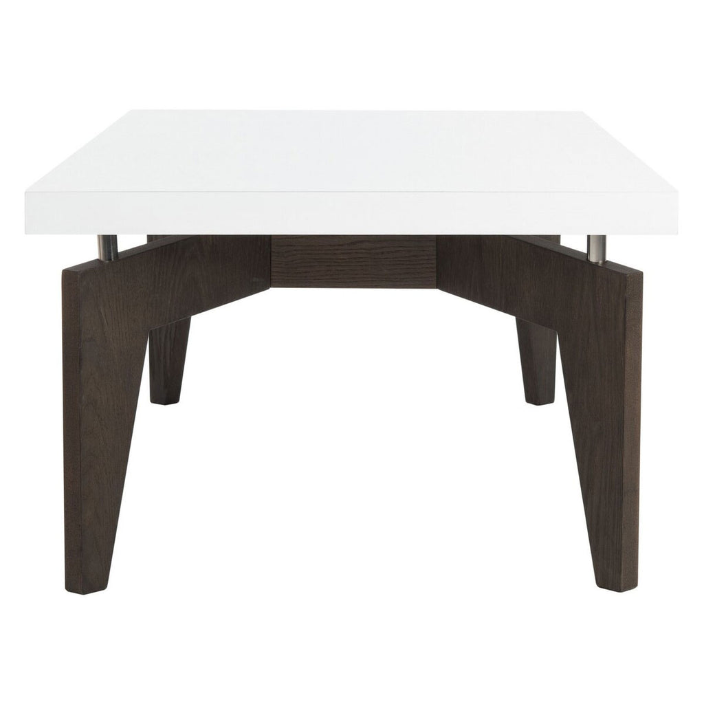 The smooth lacquered top of the low-slung coffee table appears to float on metal posts that connect it to a base of wood grained legs. Graphic and sleek, the surface of this coffee table is easy to clean and great for entertaining.