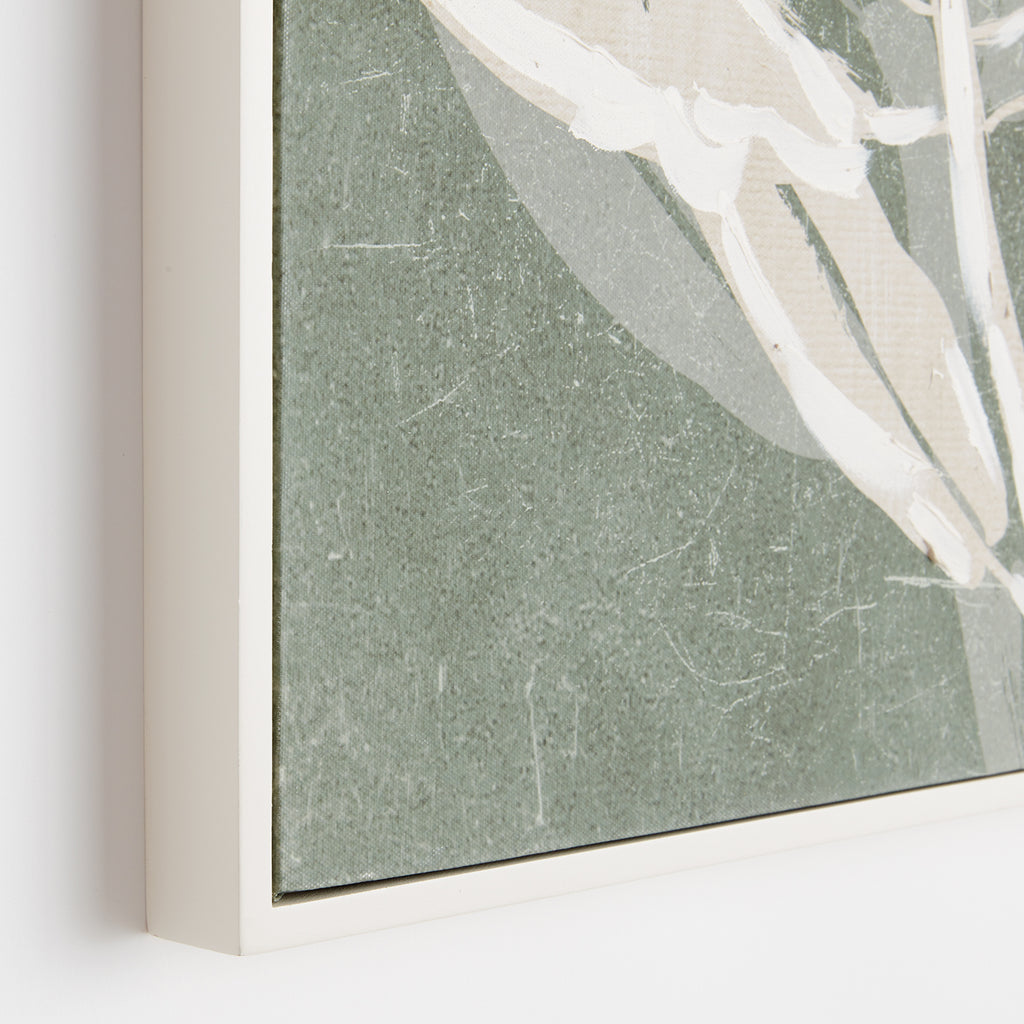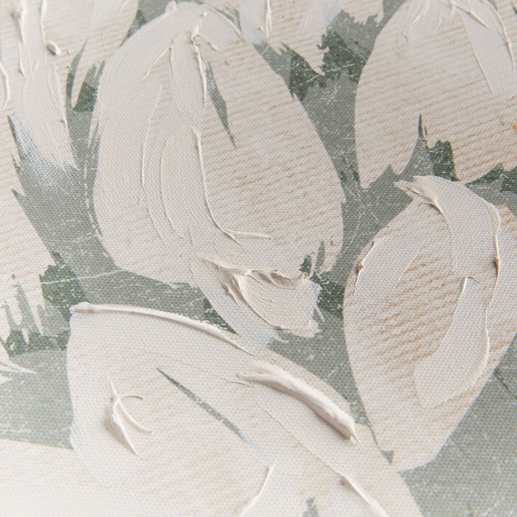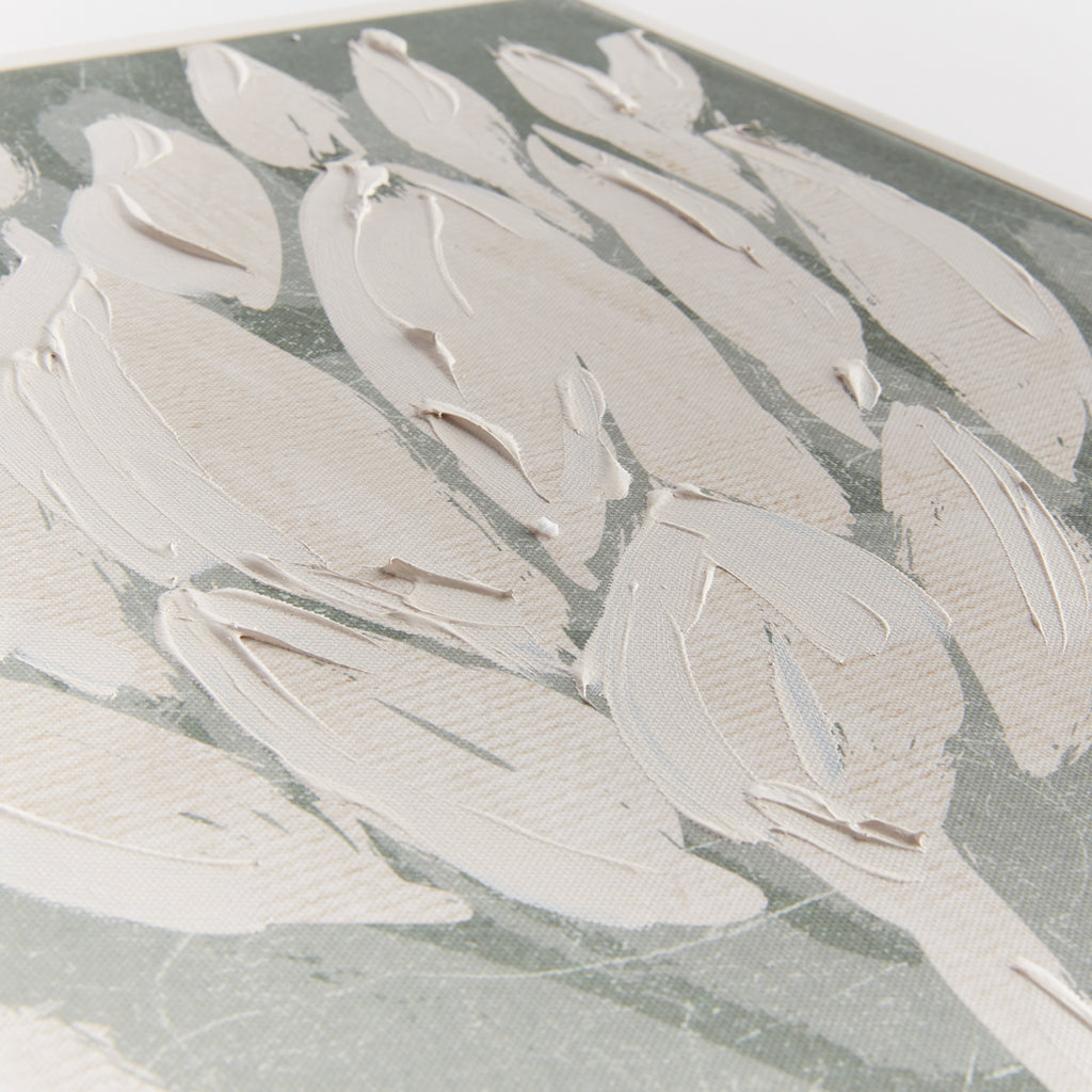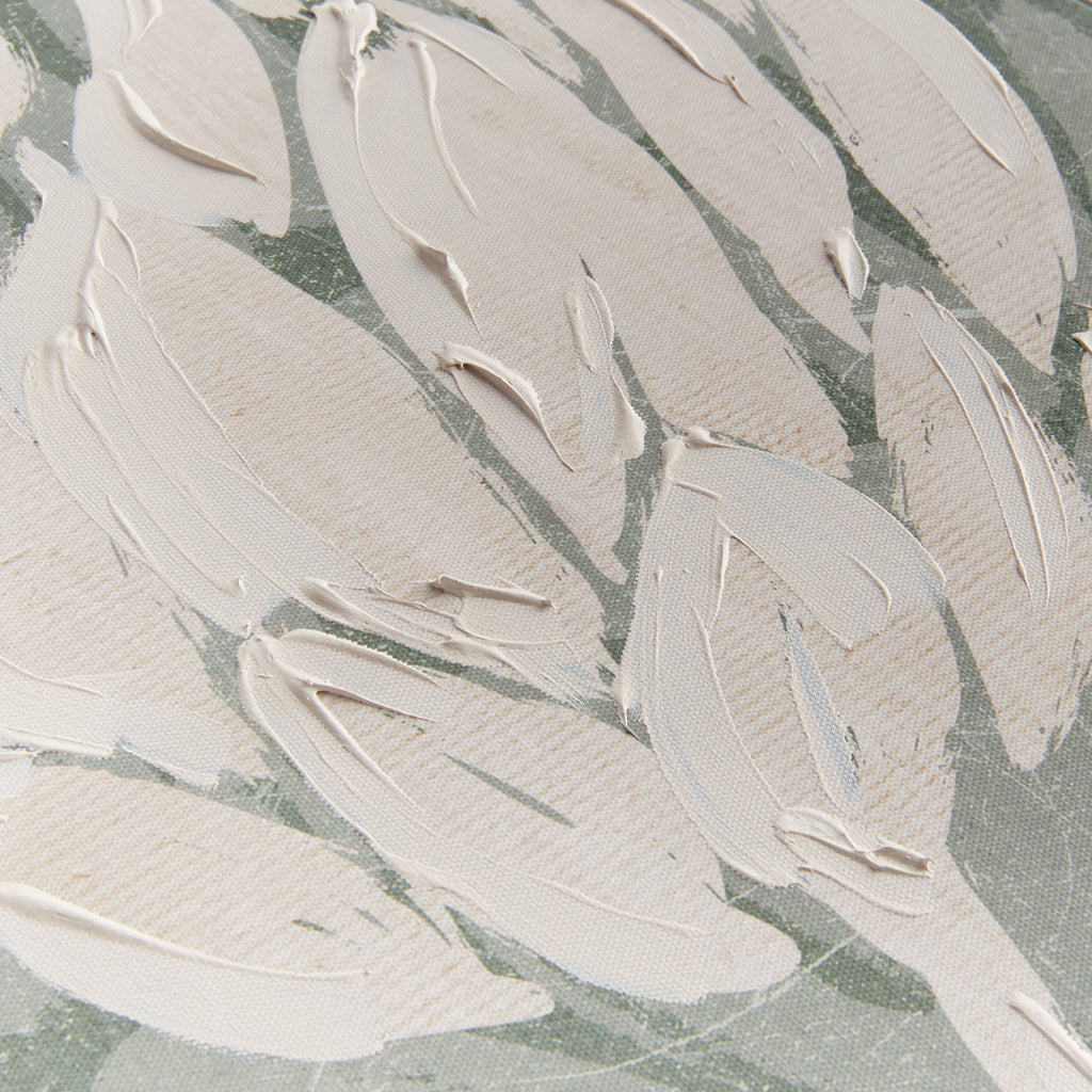 This nature-inspired triptych features batik-like forms of the protea plant complete with fir wood frames. A highly textured giclee on canvas that is embellished by hand, every brushstroke makes each piece utterly unique. Warm, neutral tones that are at home in any palette. Simply serene.