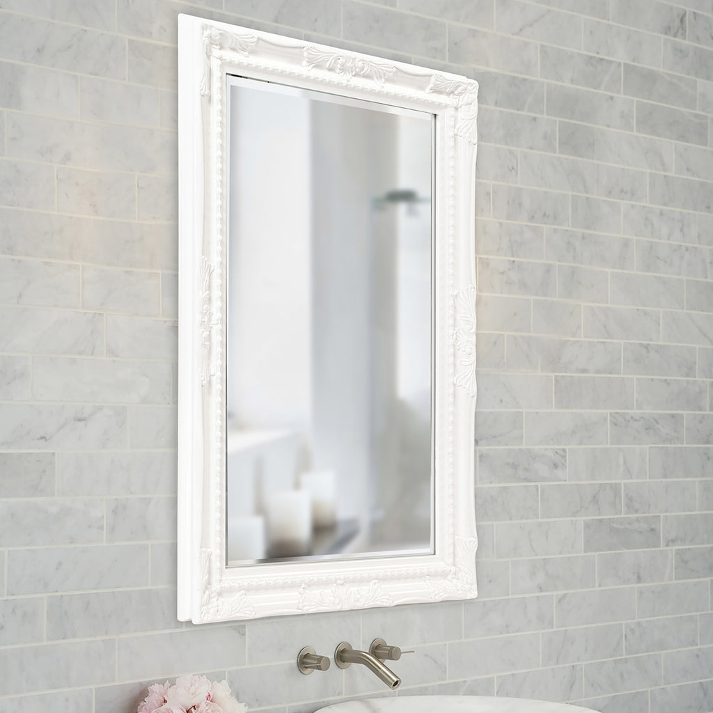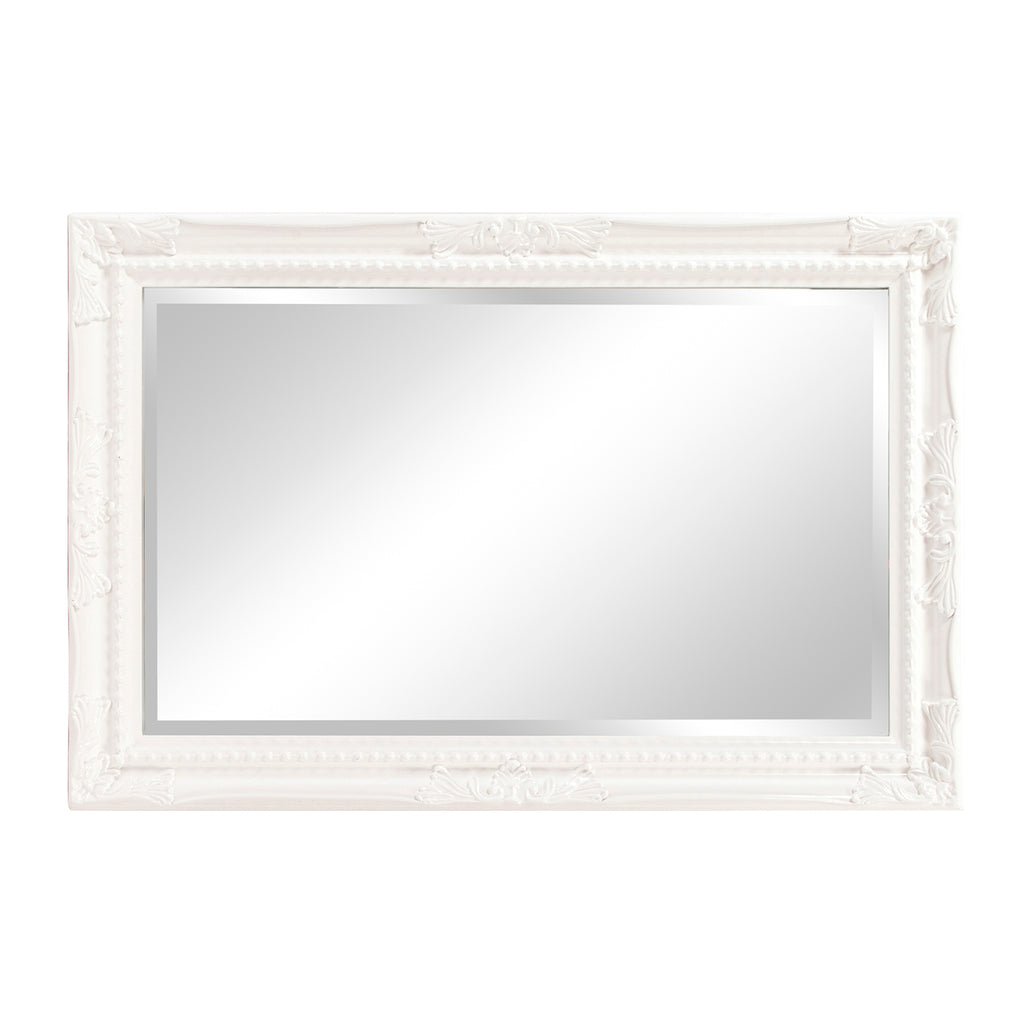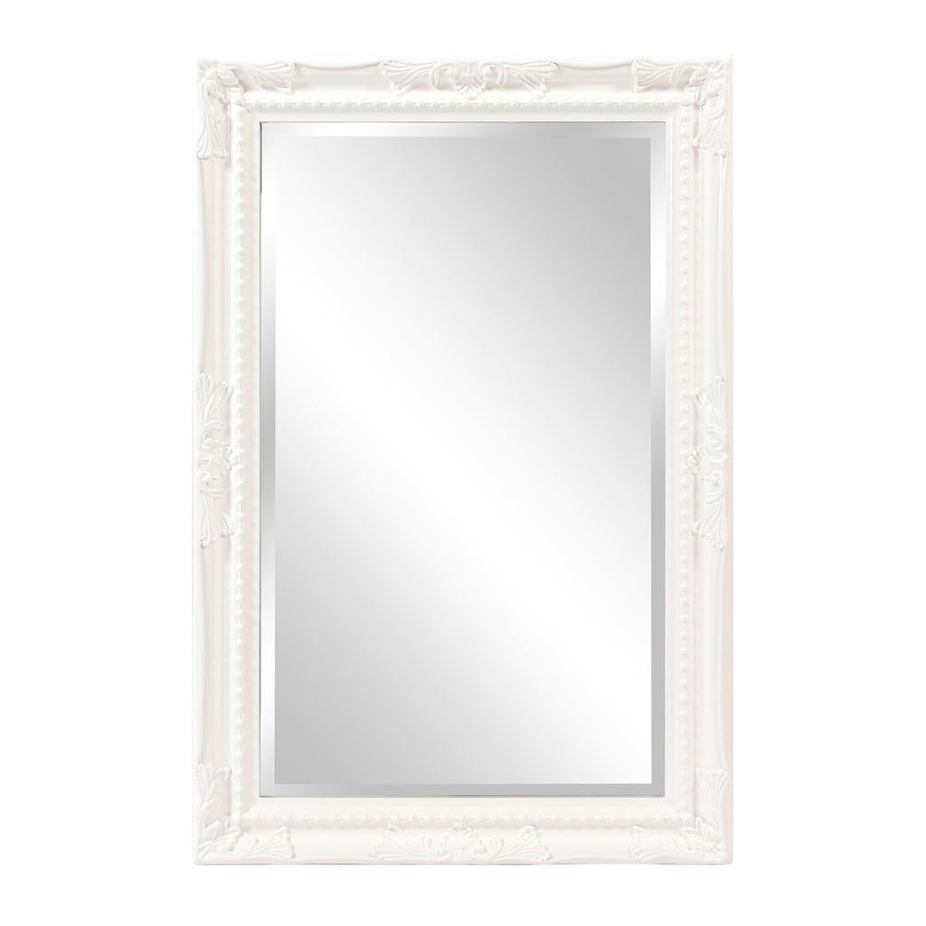 The Queen Ann Mirror features a glossy white finish. The rectangular frame is made from wood and is accented with a beaded textured inset and decorative adornments on each side of the frame. For more added detail the mirror features a one inch bevel. Its Traditional style makes this mirror a favorite for bringing some flair to your decor. This simple yet stunning piece would be a great addition to any room. It is a perfect focal point for an entryway, bathroom, bedroom or any room in your home. D-rings are affixed to the back of the mirror so it is ready to hang right out of the box in either a horizontal or vertical orientation!