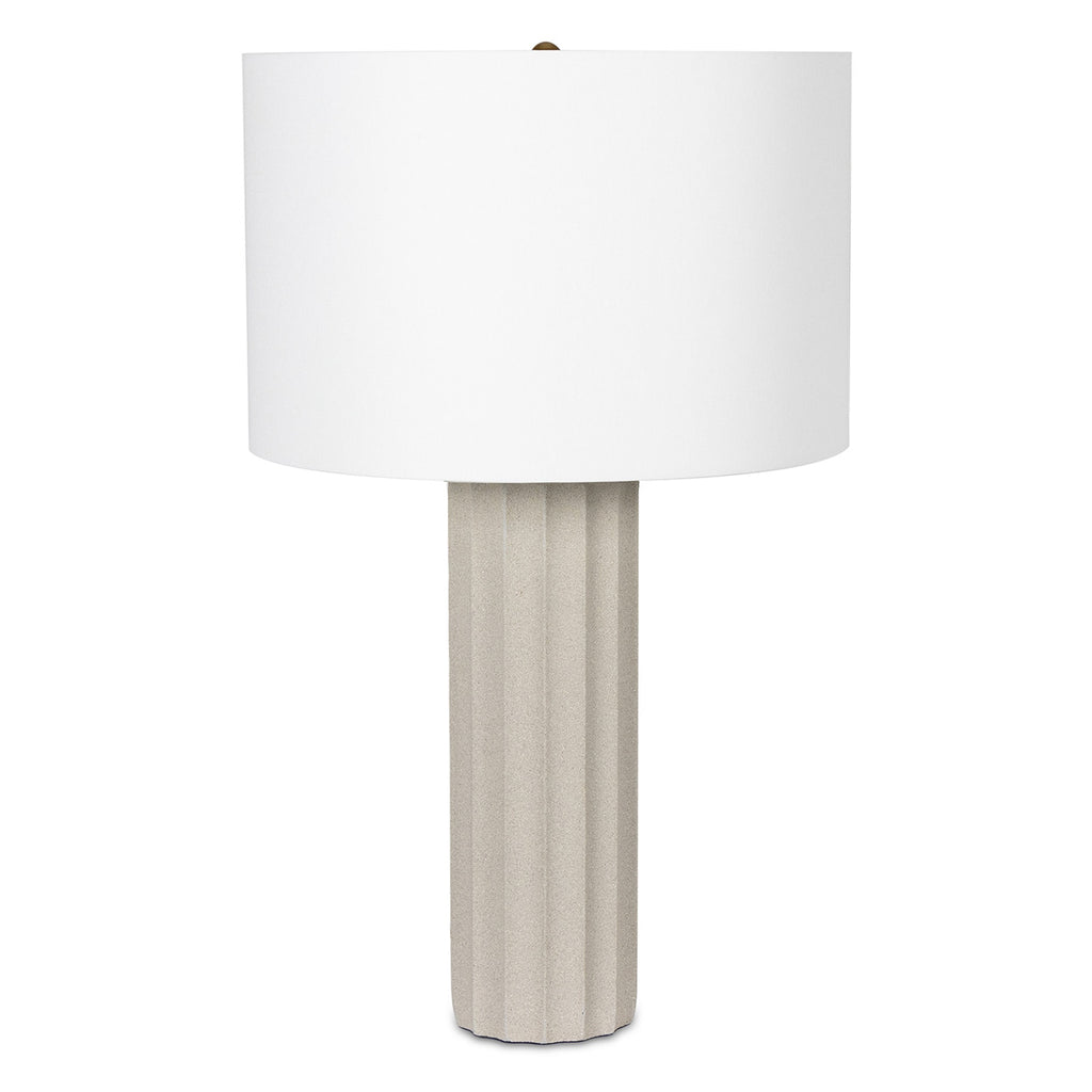 The Tambour Table Lamp features a modern scalloped design with a natural concrete base, highlighting its unique texture and shape. The elegant natural brass components complement the concrete, creating a striking contrast of materials. This blend of industrial and refined elements adds a sophisticated touch to any room, making it a stylish choice for contemporary decor.