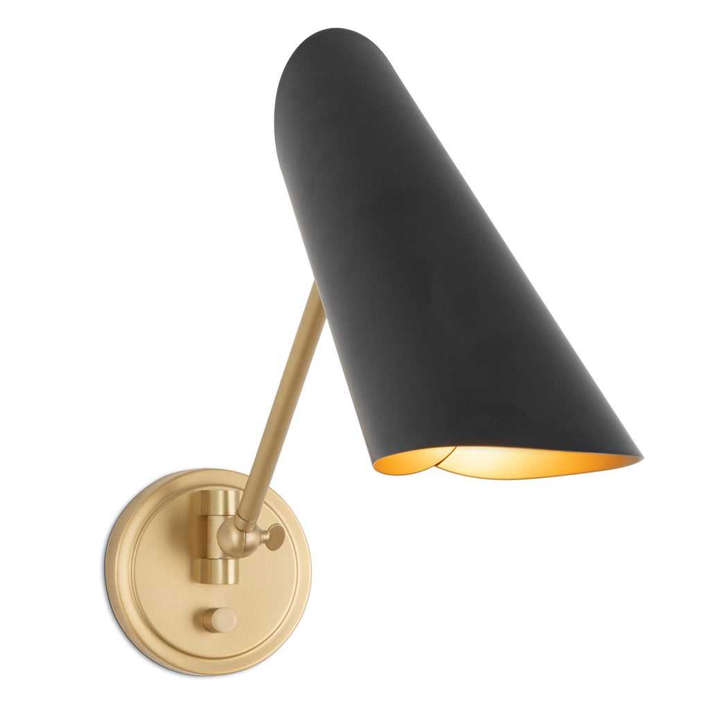 With its conical shape and two-tone finish, the Vest Swing Sconce has clean lines and is buttoned-up, much like a well-tailored tuxedo. Its swing arm allows you to position the light for different tasks. The overlapping steel fixture has a blackened brass exterior and contrasting natural brass interior with details for a distinct mid-century modern vibe.