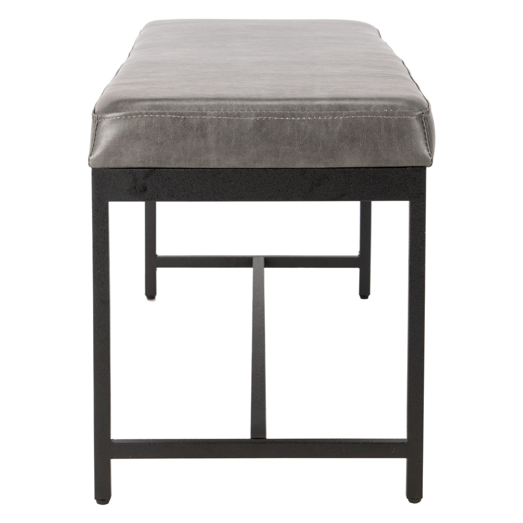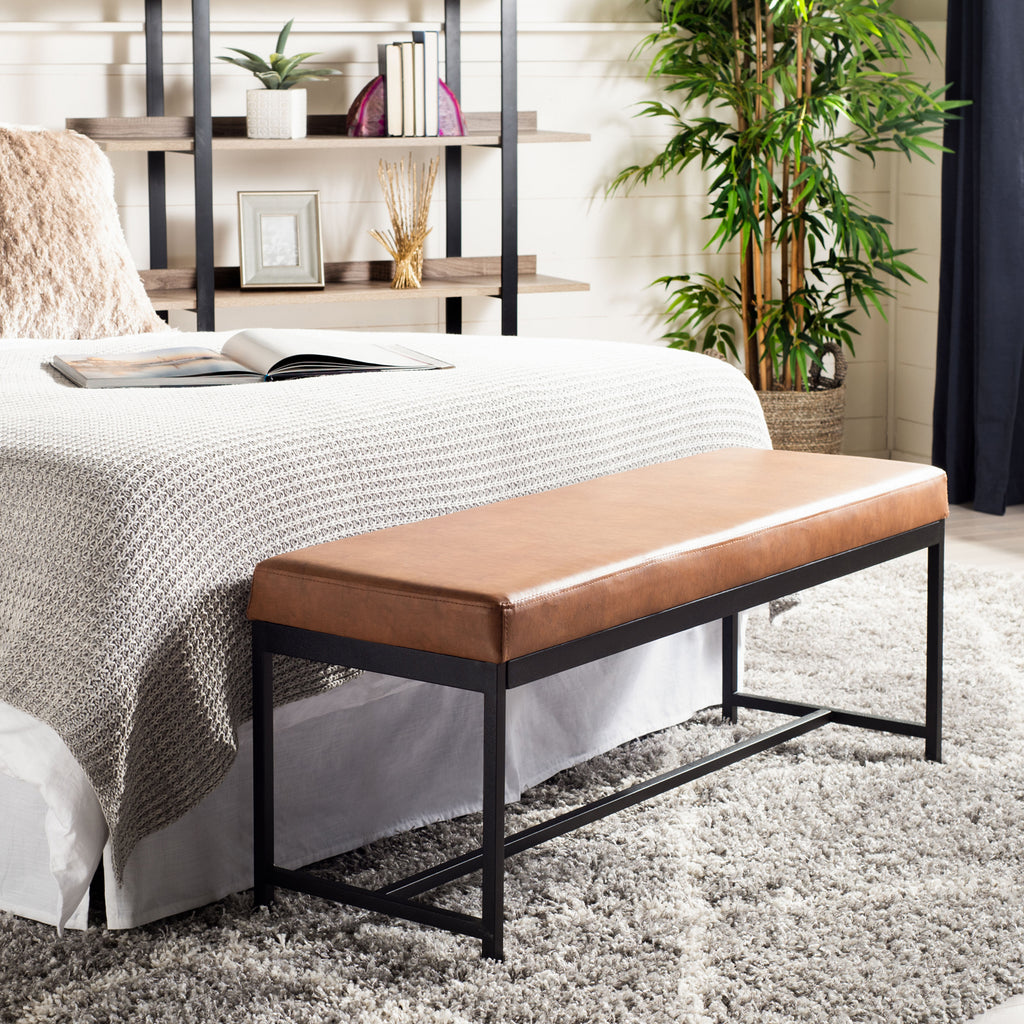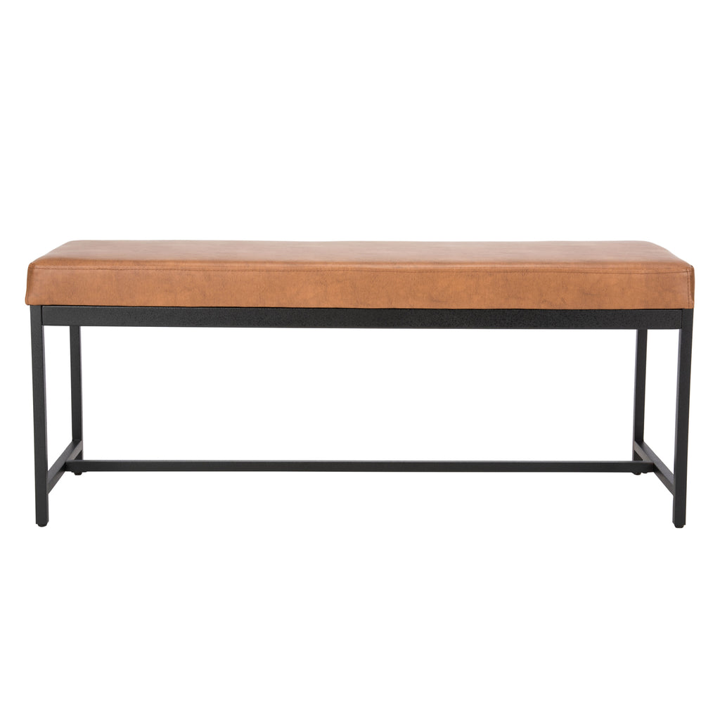 Designed for maximum versatility, this stylish faux leather Ruskin bench is perfect upgrading any living room. Its generous rich brown upholstery and sleek black metal legs complement any décor. Use as extra seating or for a tabletop for impromptu snacks.