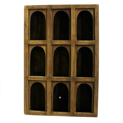 Meticulously crafted of reclaimed wood with nine arched openings for displaying auspicious items of intrigue. The Soledad Nicho hangs on a wall or stands flat on surface.