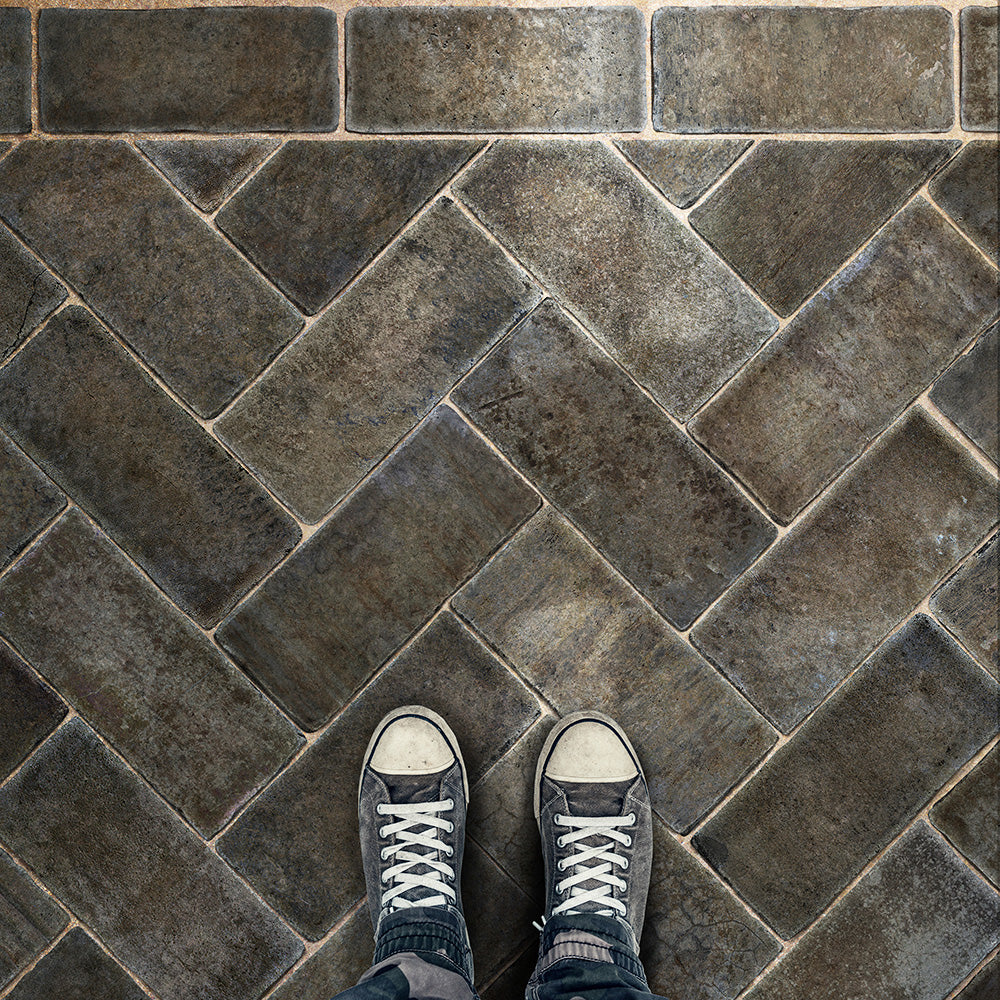 The Blacksmith's Hammer vinyl floor cloth from the Williamsburg Herringbone collection was inspired by vintage linoleum. Perfect for kitchens, baths, screened in porches and patios, the durable vinyl floorcloths are easy to clean and always lay flat. Vinyl floorcloths are made with two-ply vinyl with latex padded backing, designed to be fade-resistant in direct sunlight and durable against the elements but work best in controlled outdoor environments.