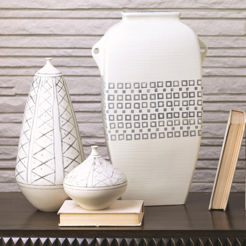 The delicate pattern enclosing these vases was inspired by and adapted from a large and important collection of salt glazed, blue and white German stoneware, known as Westerwald. The originals date to the 18th century and are in the collections of the Museum of International Folk Art.