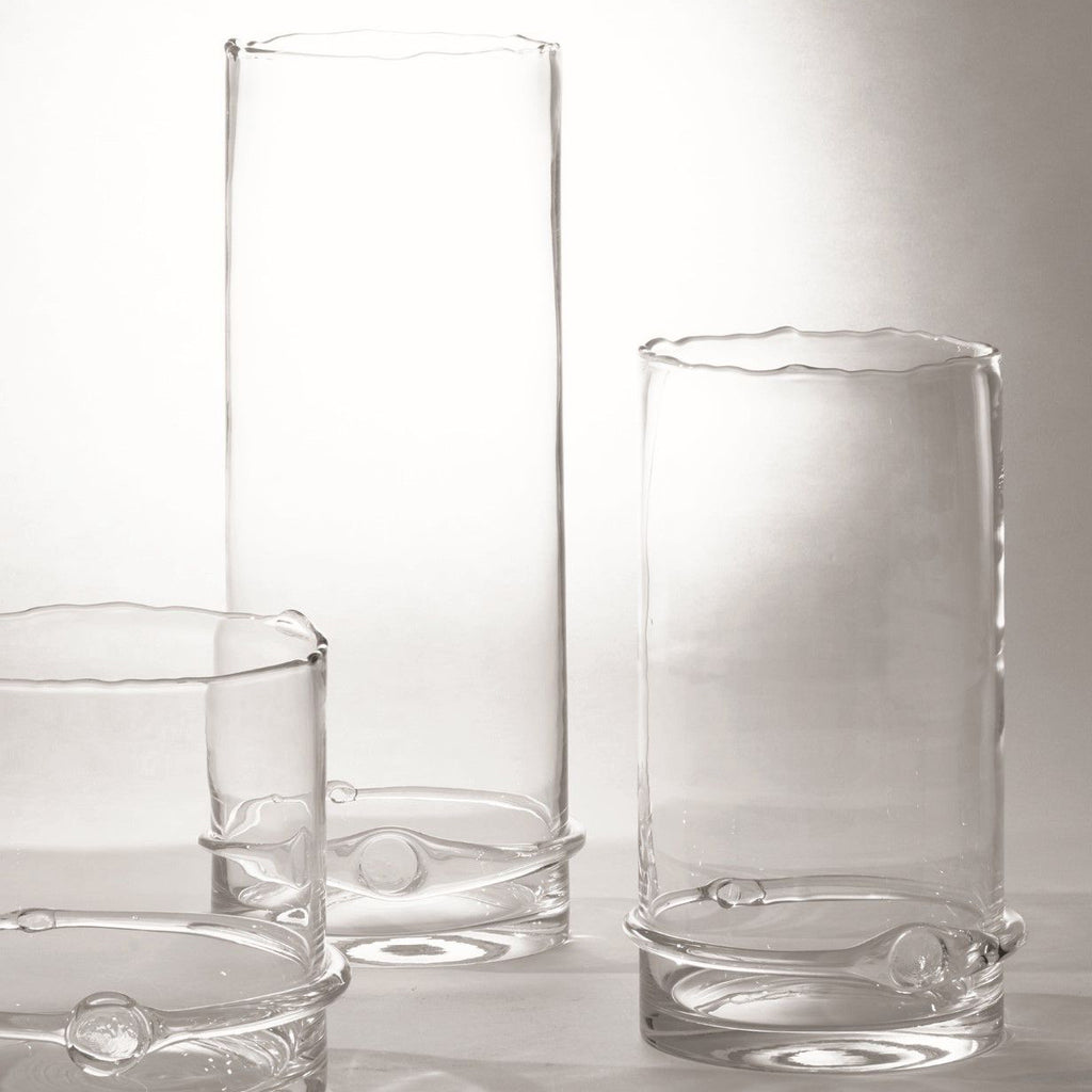 The Studio A Intaglio Hurricane is a of beautiful Polish crystalline features a hand-applied glass ribbon near the base with an intaglio or stylized seal in the center. An irregularly shaped rim is another unique detail.